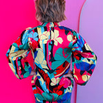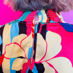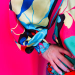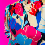 • Vibrant abstract floral print in coral, red, yellow, green, blue, and black
