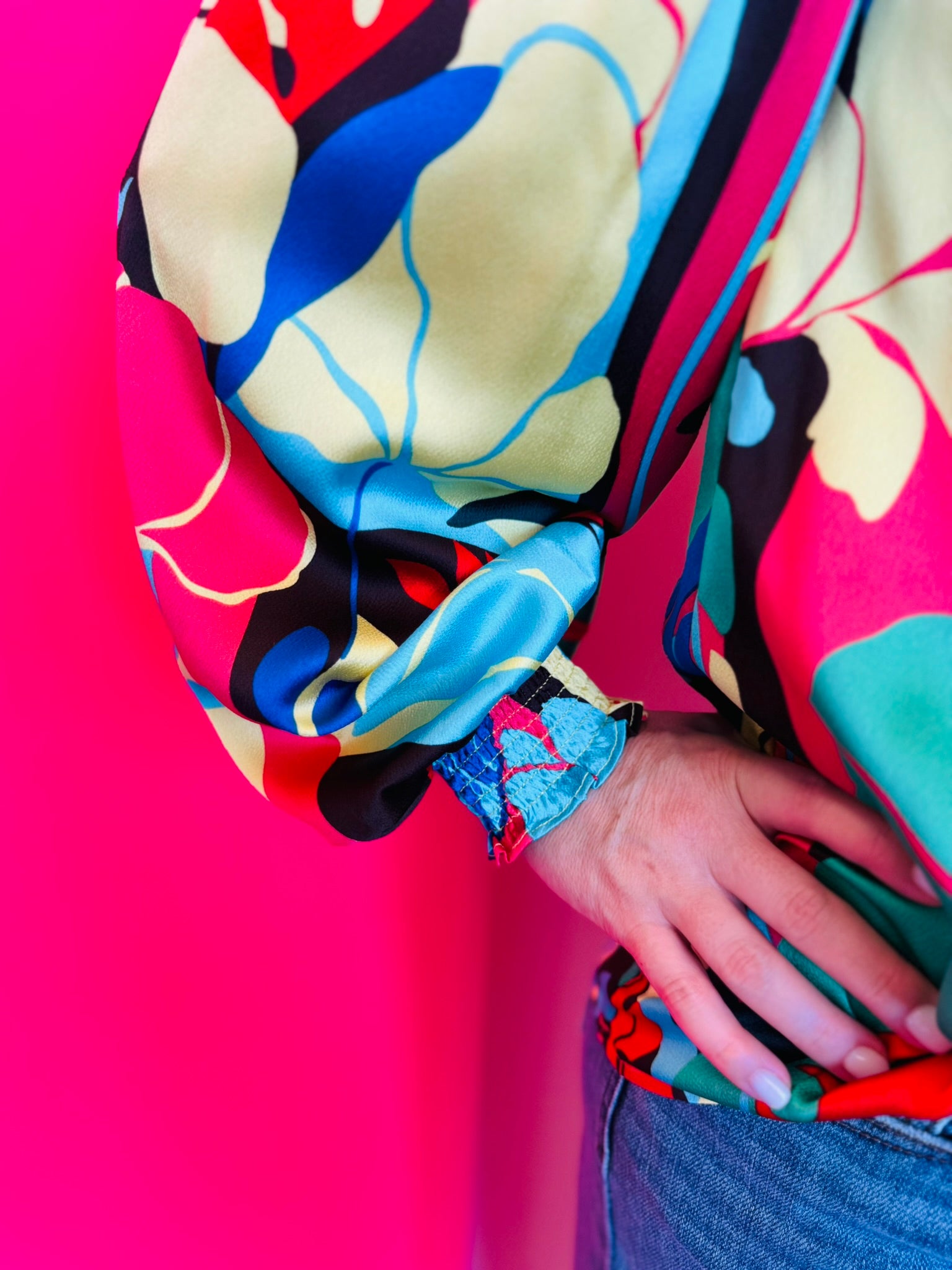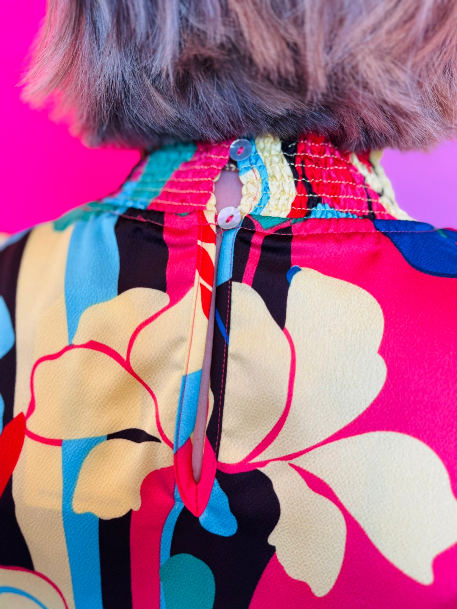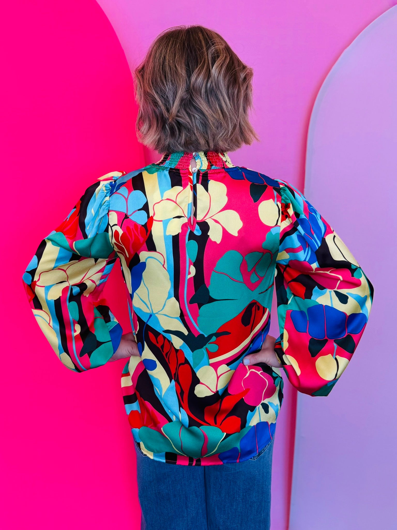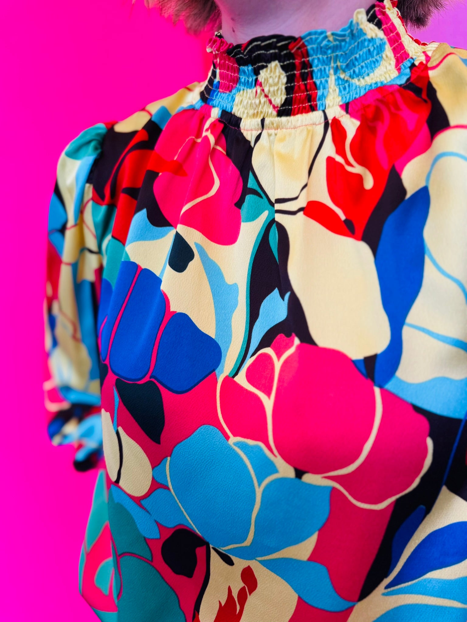 Brighten your wardrobe with the Coral Mix Top, a vibrant blend of color and effortless femininity. Featuring an abstract floral print in striking shades of coral, red, yellow, green, blue, and black, this lightweight blouse brings bold personality to any outfit. The smocked neckline and cuffs add flattering texture and comfort, while the long peasant sleeves and back keyhole closure create a soft, flowy silhouette that moves beautifully. Crafted from 100% polyester, it’s non-sheer and lightweight, making it the perfect choice for layering or wearing on its own for a polished yet playful look.