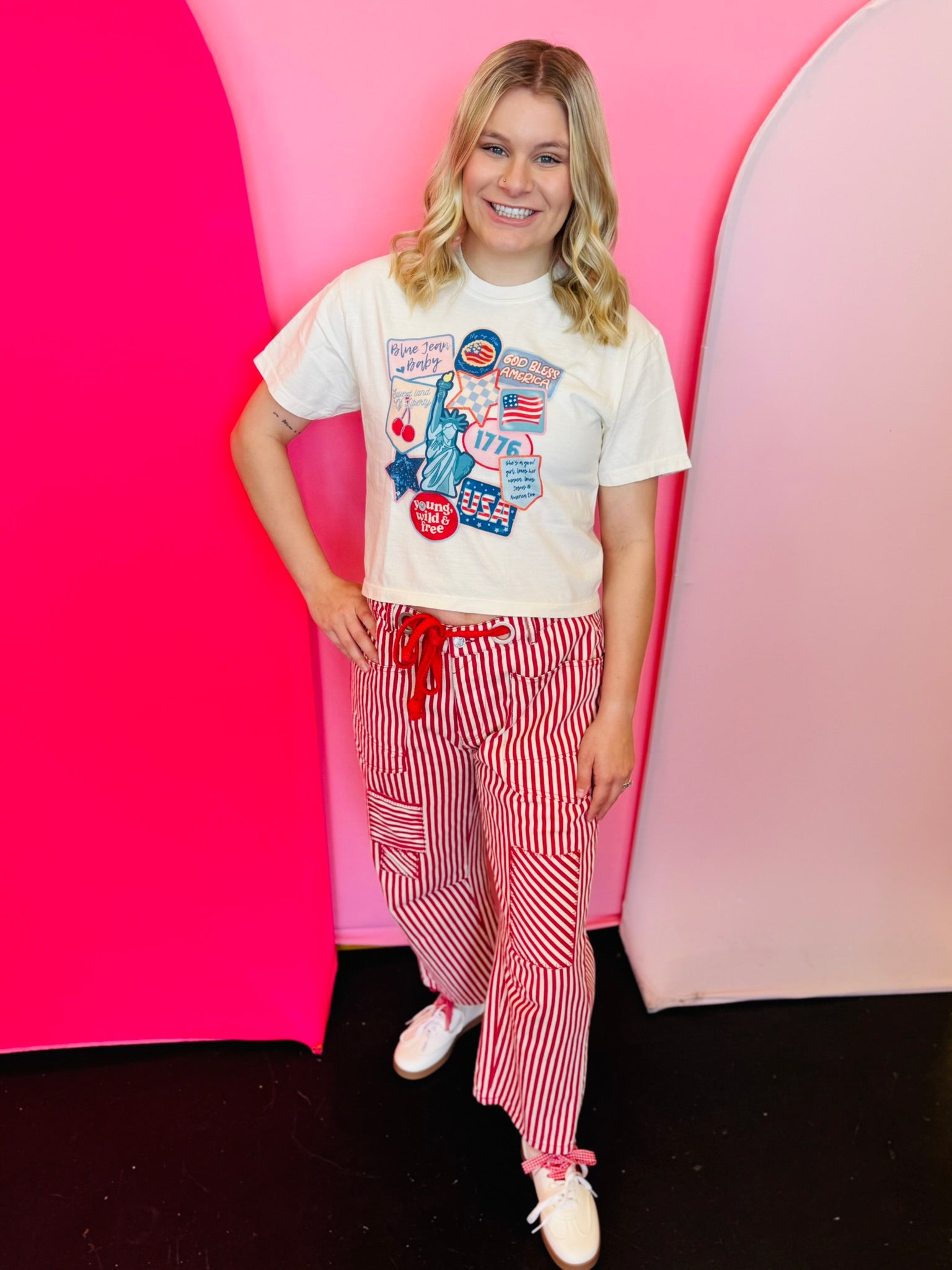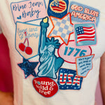 Show off your all-American style with the Patriotic Patch Cropped Tee — a fun, retro-inspired piece made for sunny celebrations and everyday wear. Designed on a soft cream base, this cropped tee features a playful collection of vintage-style patriotic patch graphics that bring personality and nostalgia to your outfit. Iconic details like the Statue of Liberty, USA lettering, classic stars, American flags, and “Young, Wild & Free” accents create a bold yet wearable design full of hometown pride.