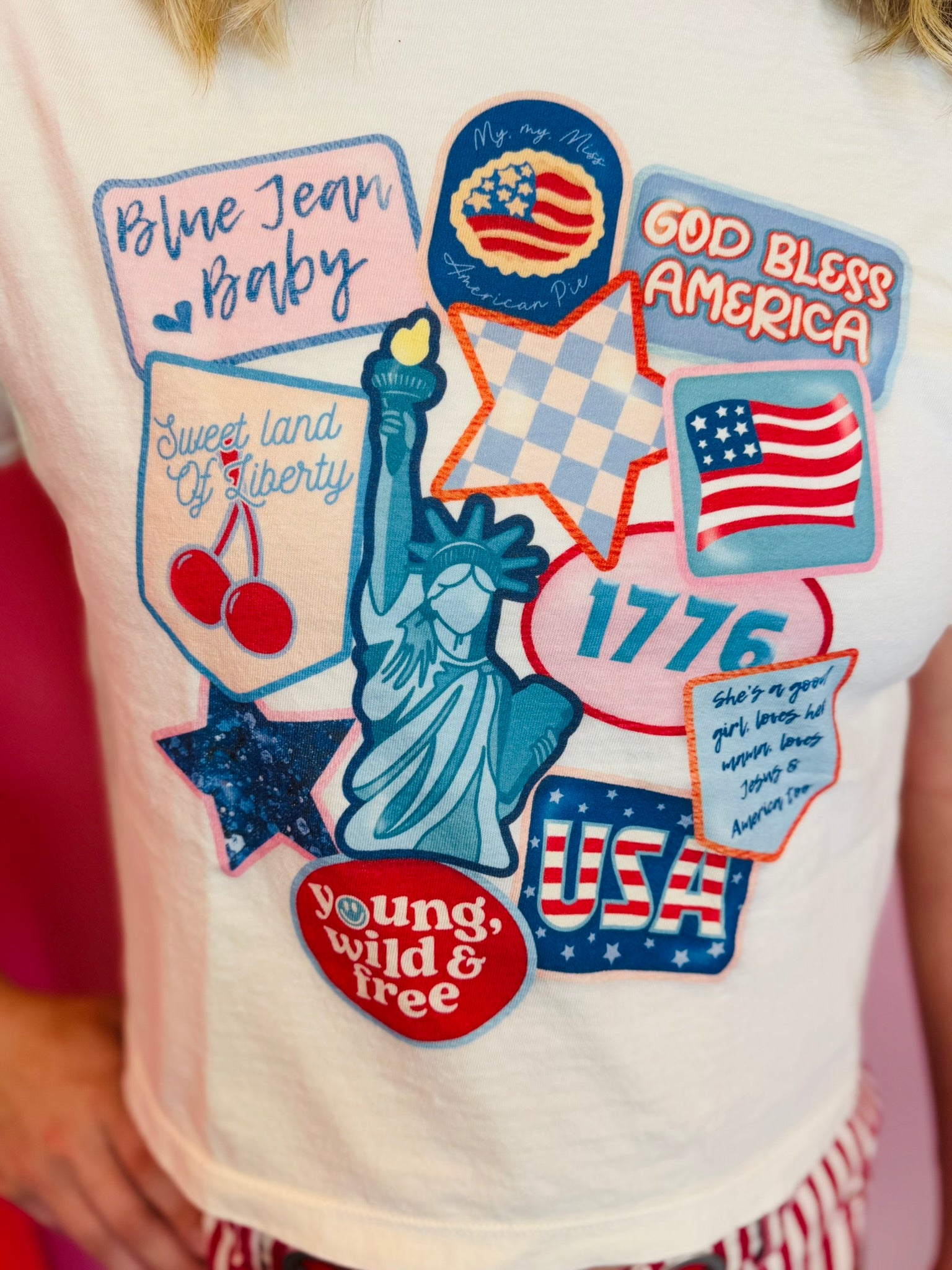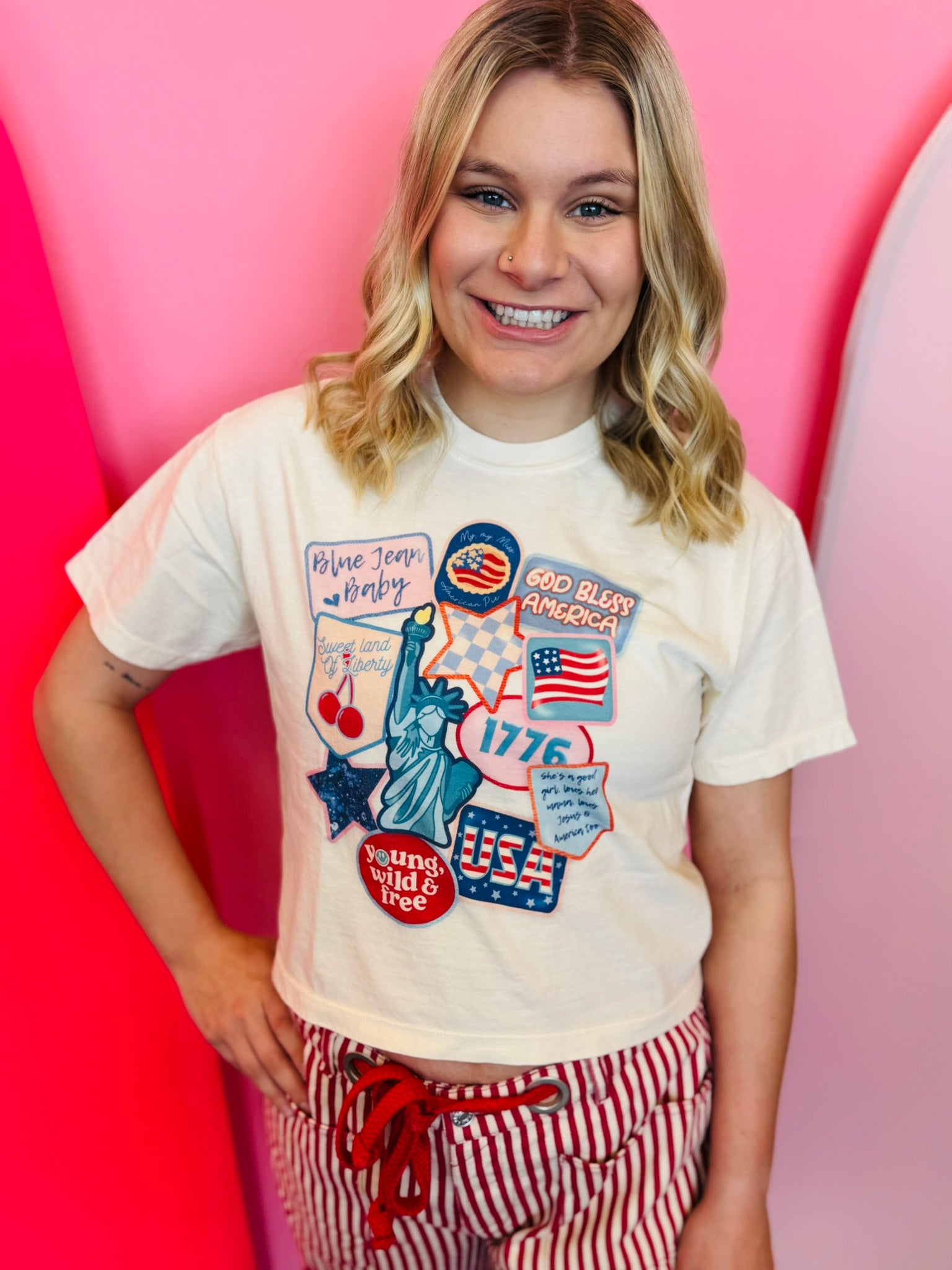 Cream cropped patriotic graphic tee with vintage USA patches, stars, flags, and retro Americana icons