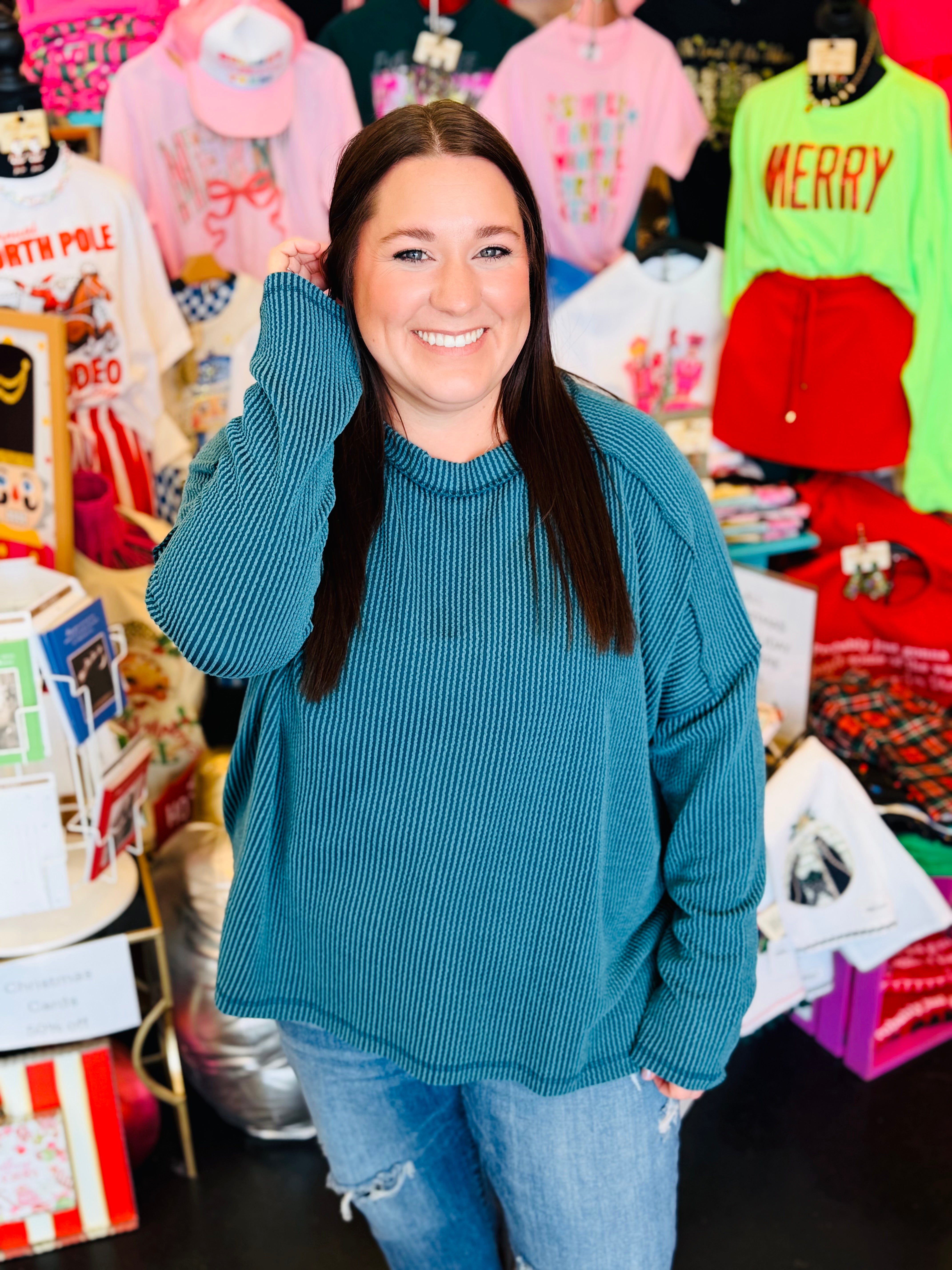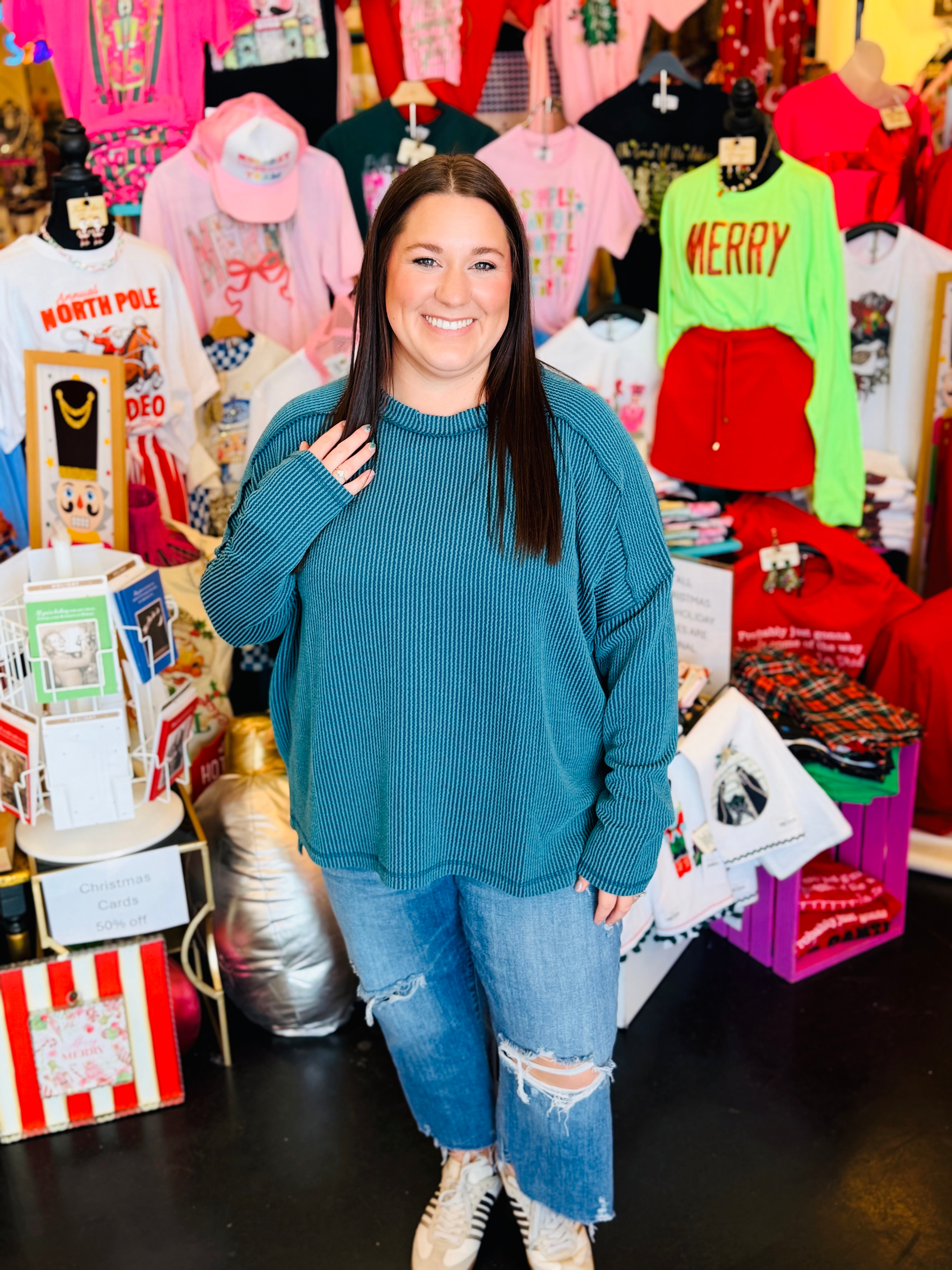 Plus-size teal ribbed boat neck long sleeve top with raw edge detailing.