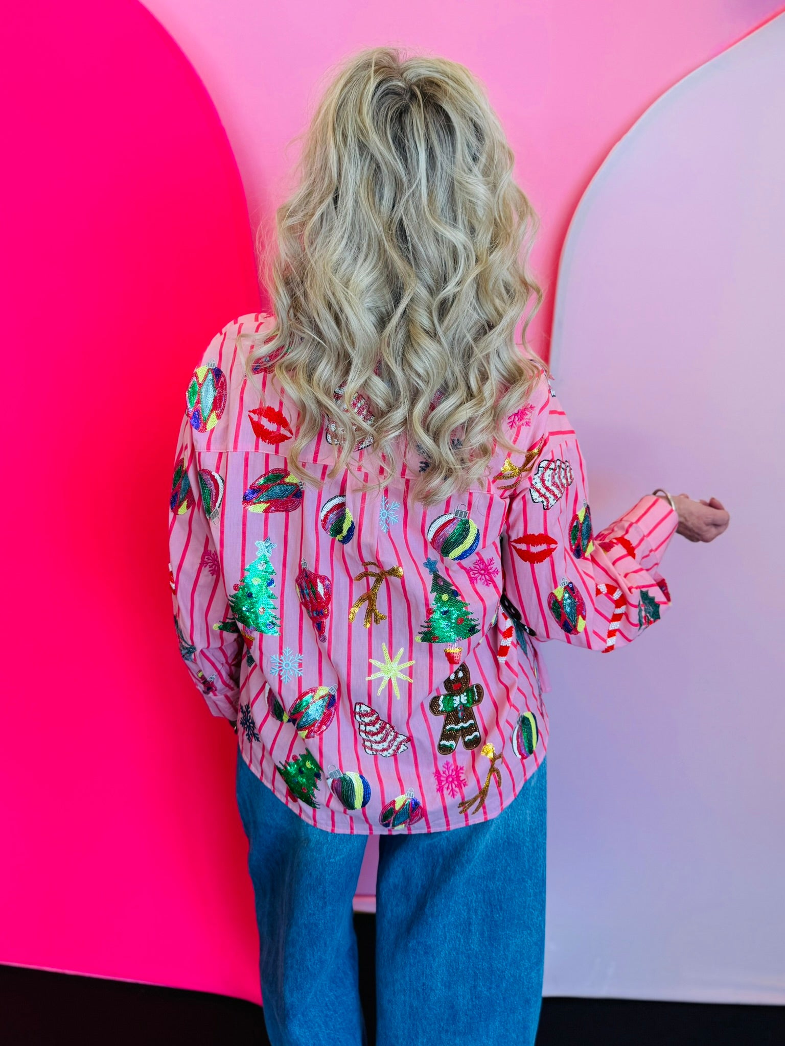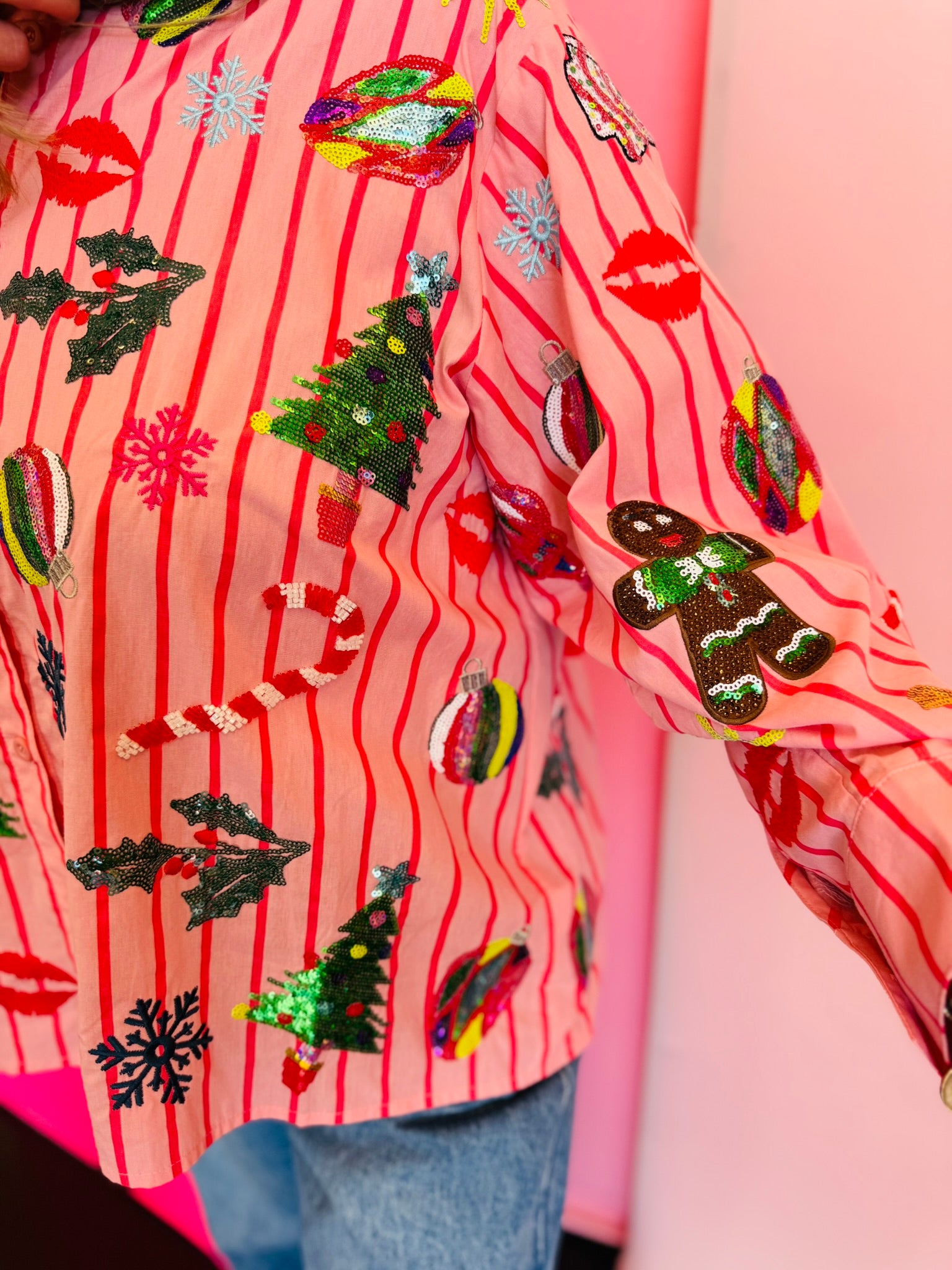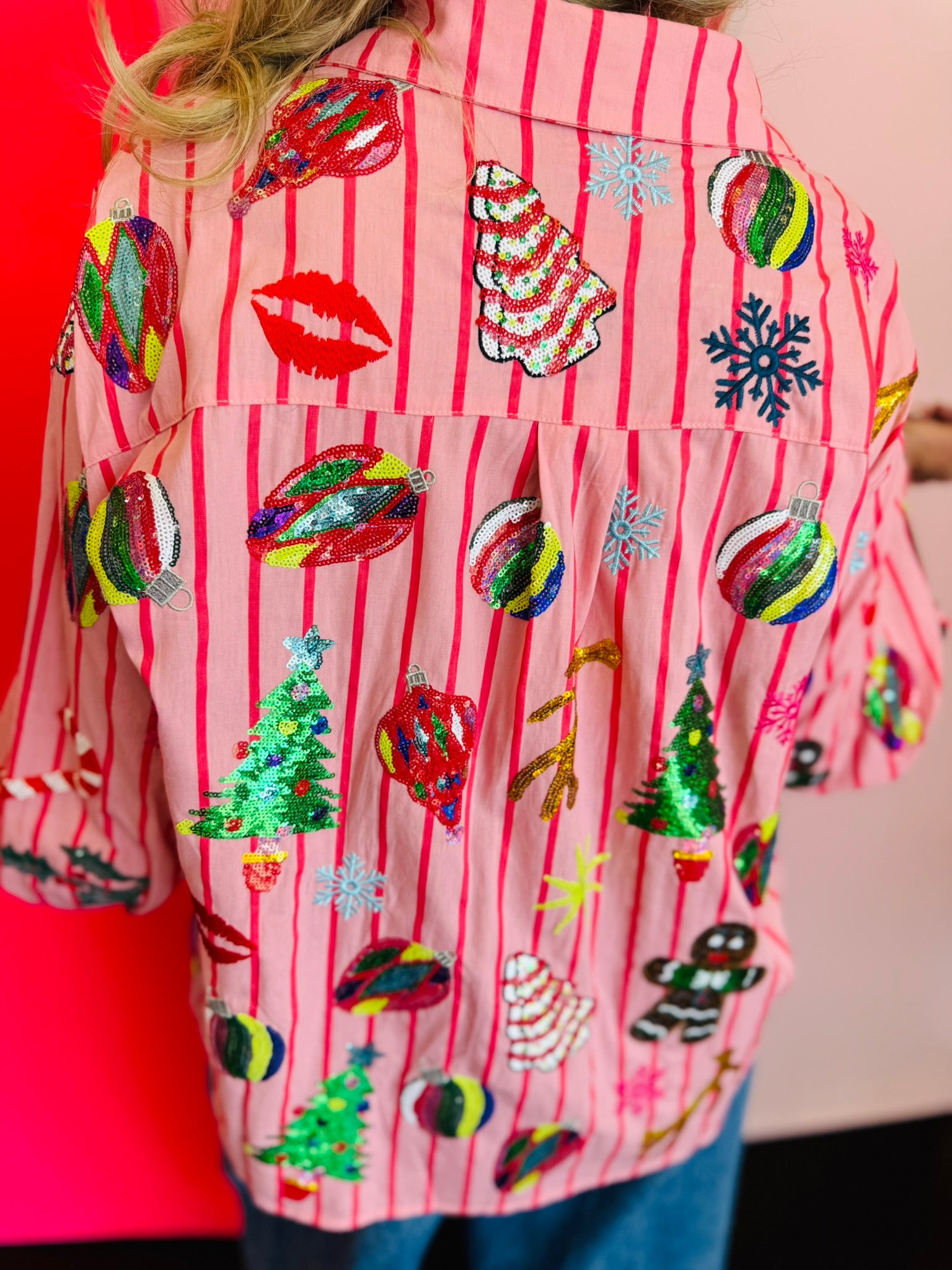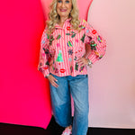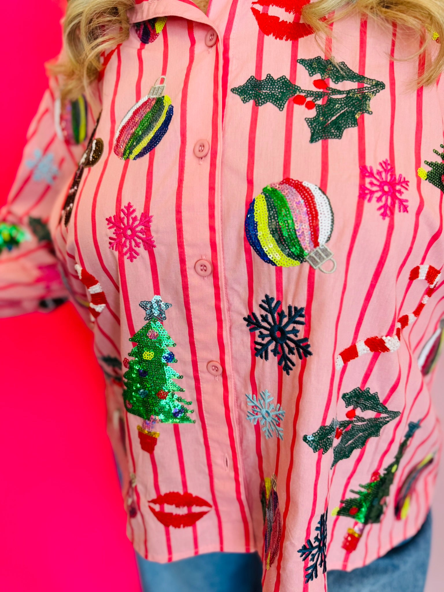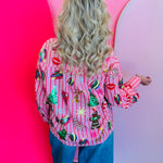 Shine bright this holiday season with the Queen Of Sparkles Light Pink & Red Stripe Christmas Icons Button Up Top. Crafted from 100% cotton for a soft, breathable feel, this festive blouse features cheerful pink and red stripes adorned with sparkling sequin holiday icons—including Christmas trees, ornaments, gingerbread men, candy canes, snowflakes, and mistletoe. Each sequin detail catches the light beautifully, adding a touch of glam to your seasonal style. The button-up front and collared neckline give it a polished finish, making it perfect for pairing with jeans, skirts, or tailored pants for any holiday event. Celebrate the season in style with this iconic, joy-filled piece from Queen of Sparkles.