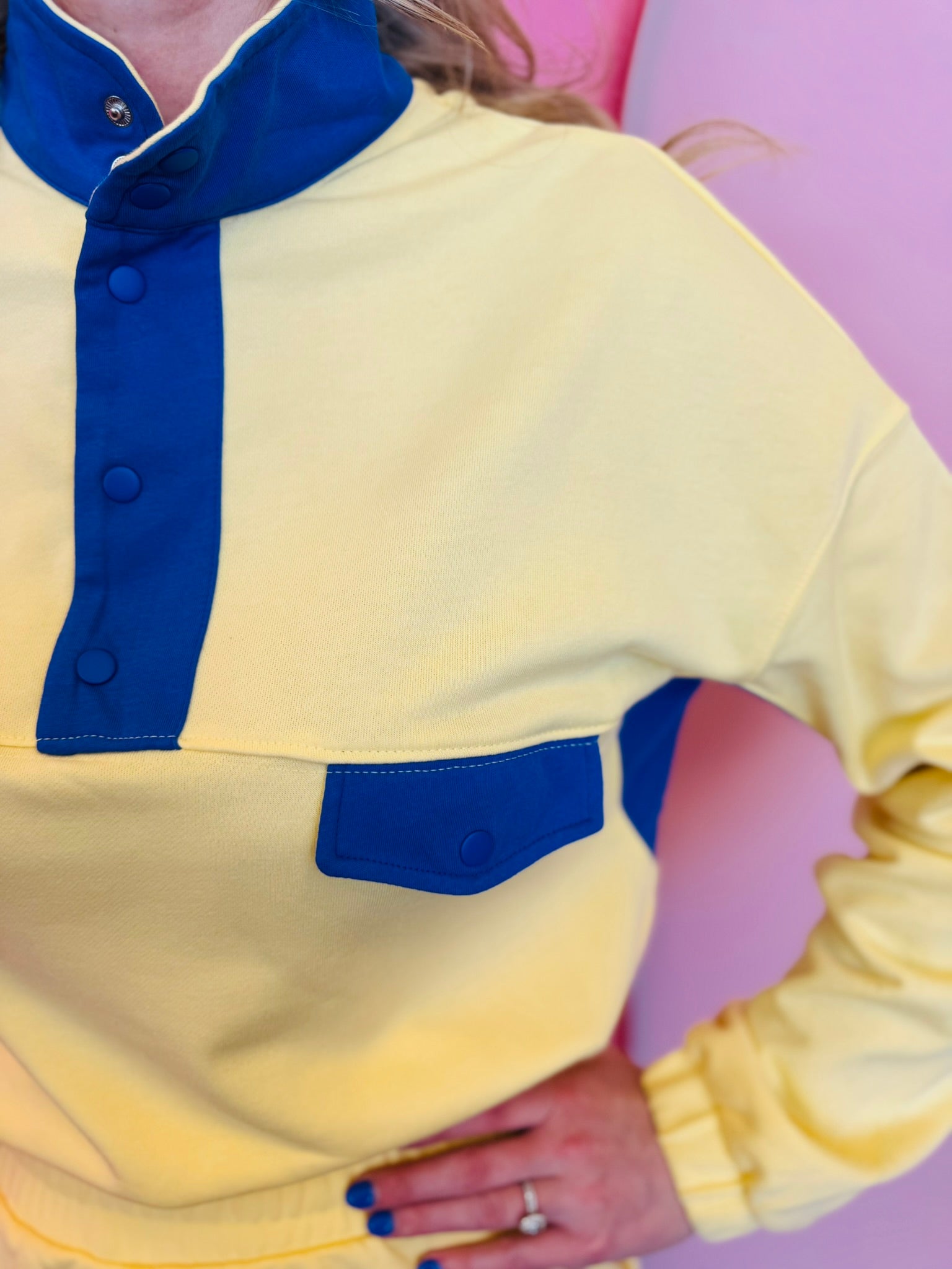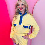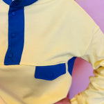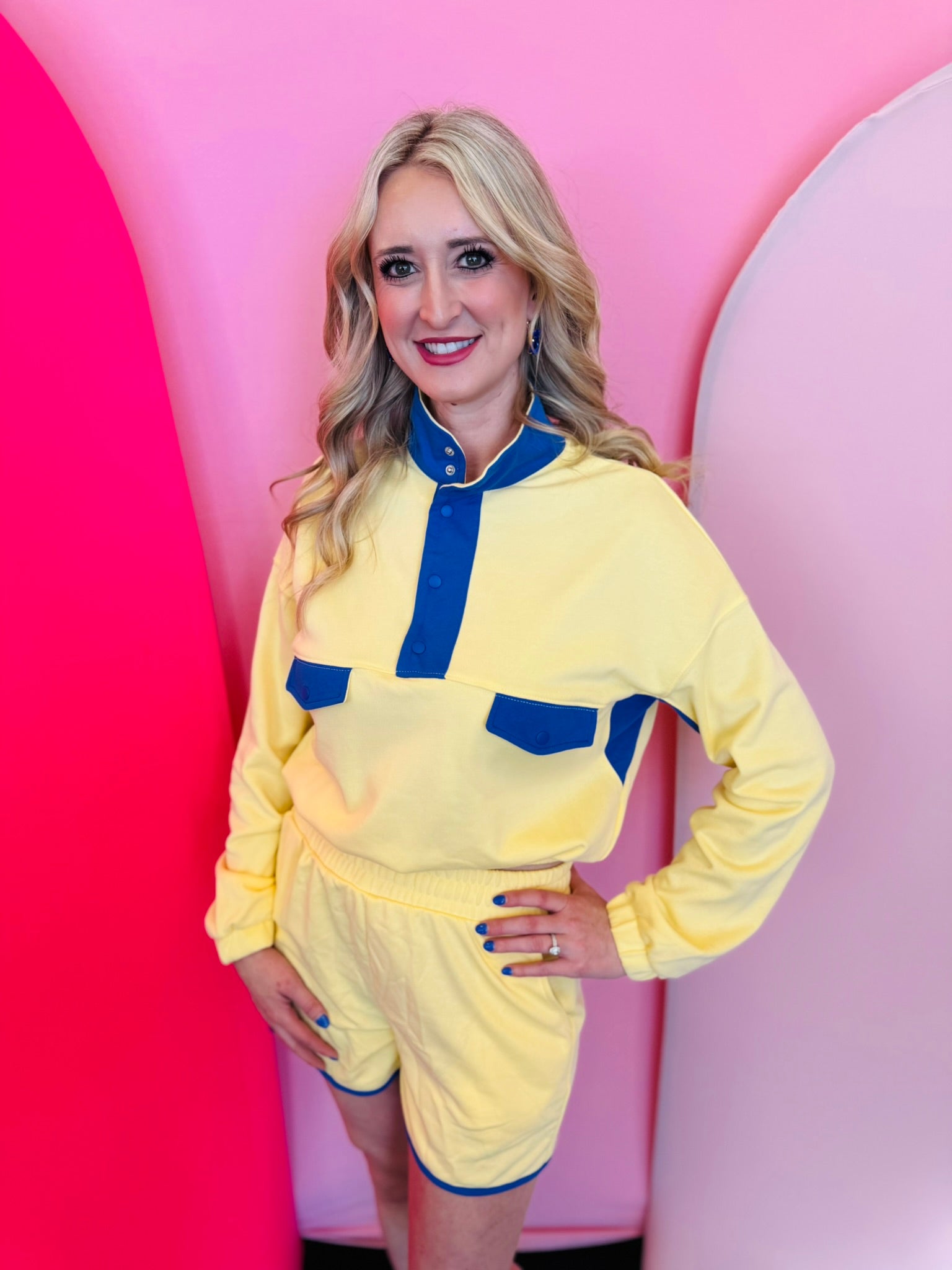 Designed in a soft yellow textured fabric, this set stands out with bold royal blue contrast accents that give it a sporty, modern look. The long-sleeve pullover top features a snap-button collar and contrast pocket details, adding both style and function. The coordinating shorts are comfortable and easy to wear, making this set perfect for casual days, travel, or relaxing in style.