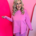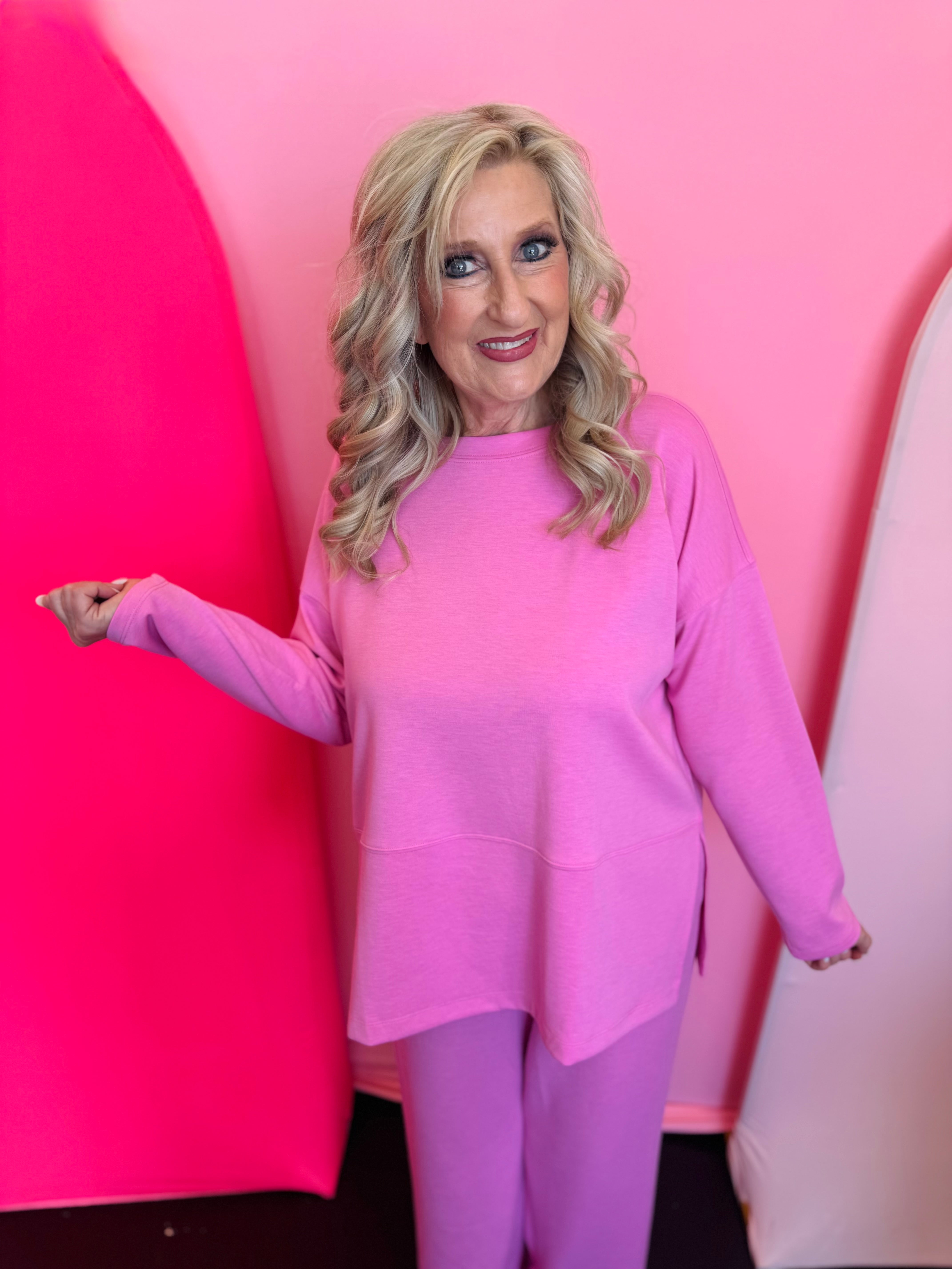 Make a bold statement in comfort with our Pink Scuba Lounge Set, the perfect blend of chic style and everyday ease. This two-piece matching set includes a side slit top and wide-leg pants crafted from a premium 90% polyester, 6% rayon, and 4% spandex scuba blend that’s ultra-soft, stretchy, and sleek. The top features a 27" body length and 45.75" bust (approx., size small) for a relaxed, flattering fit, while the pants include a 25.5" relaxed waistband and 29" inseam for effortless comfort. The elastic waistband and flowy silhouette make this set perfect for lounging, travel, or dressing up with accessories. Bright, confident, and irresistibly cozy, this pink lounge set is where comfort meets modern fashion.