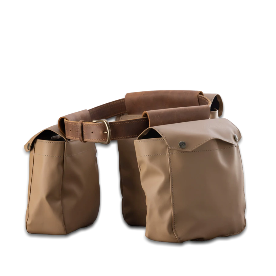 Our new and improved bird bag includes 3 bags that can be removed from the belt. Included are two side bags and a larger bag that can be personalized. Wipe clean with a damp cloth. NOT machine washable.