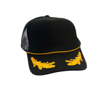 Rule the high seas of fashion with our Black Captain Foam Trucker Hat. Featuring an embroidered bill and a flashy gold rope accent, this foam front trucker hat is both stylish and comfortable with its mesh back and adjustable snapback enclosure. Add some of our unique patches for a personalized look. Don't miss out on this must-have accessory!