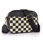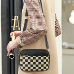Elevate your everyday style with our Black Checkered Crossbody Bag, a versatile accessory perfect for both daytime outings and evening events. Crafted from soft vegan leather, this chic bag offers a luxurious look and feel while staying cruelty-free. The bold black checkered design brings a modern, eye-catching edge to any outfit, while the secure zipper closure keeps your essentials safe. Thoughtfully sized at 9.05” L x 6.49” H x 2.36” W, it provides ample space for your phone, keys, wallet, and small must-haves without adding bulk. The adjustable and removable strap lets you wear it crossbody for hands-free convenience or carry it as a sleek clutch. From casual brunches to nights out, this fashion-forward camera bag is the perfect finishing touch.