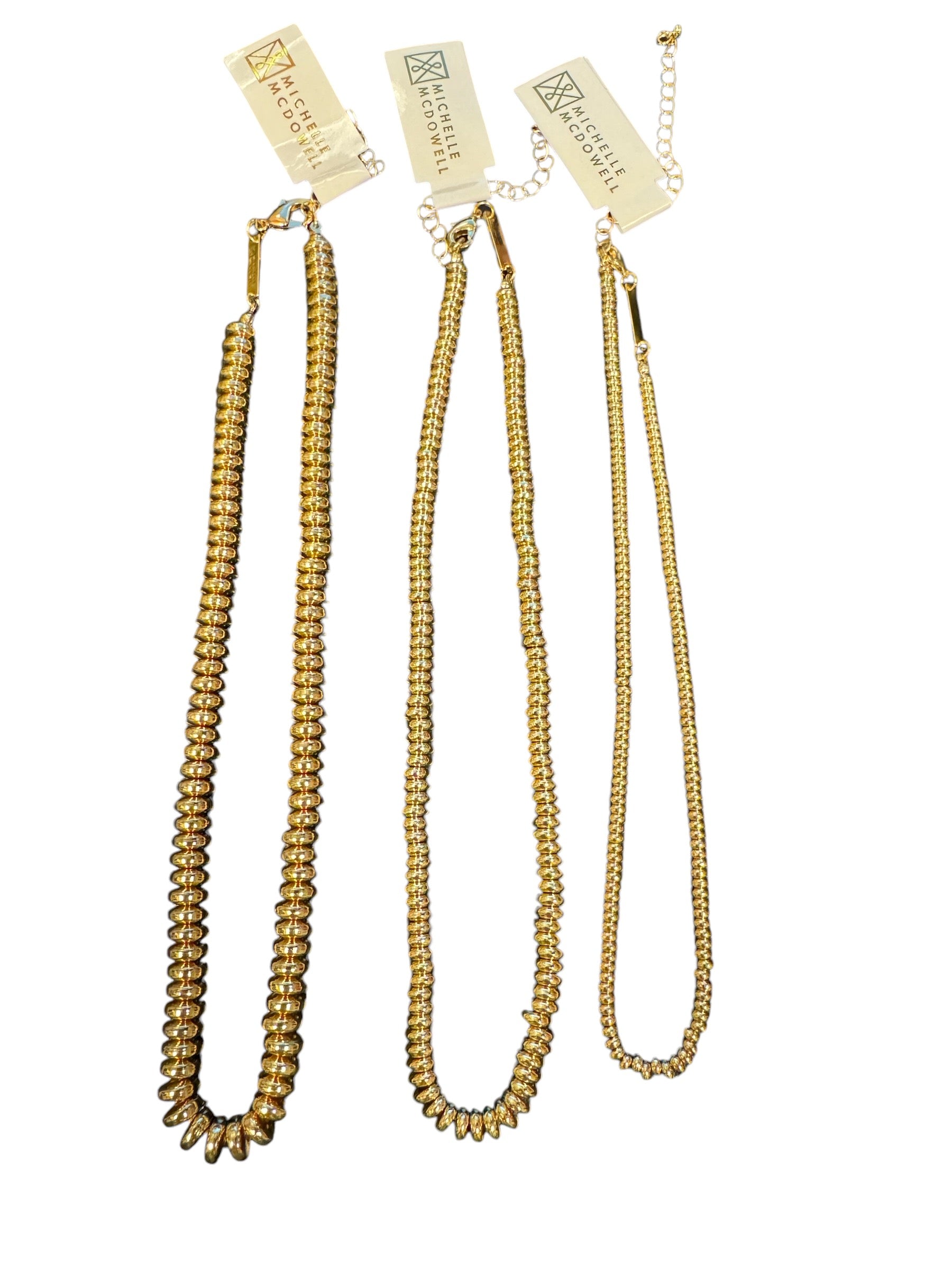 This elegant necklace features shimmering gold puff disc beads available in three sizes: small, medium, and large. With a 3 inch adapter, it can be effortlessly adjusted to fit any neckline. Add a touch of sophistication to any outfit with the Blake Gold Disc Necklace.