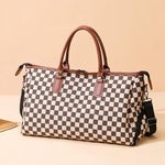Travel in style with our Camel Checkered Canvas Weekender Duffle Bag, the perfect companion for weekend getaways, business trips, or gym sessions. This trendy, travel-ready duffle showcases a warm camel checkered canvas design that’s both fashion-forward and practical. Made from a durable PU, Oxford, and polyester blend, it is built to endure frequent trips while remaining waterproof and easy to clean. Smart features such as a side shoe compartment, multiple inner pockets, and an adjustable strap keep your belongings organized and accessible. Measuring 19.69” L x 11.03” H x 9.06” W, it provides ample space for clothing, shoes, and accessories without adding bulk. Whether you’re heading out for a road trip or to the gym, this versatile weekender bag blends modern style with everyday functionality.