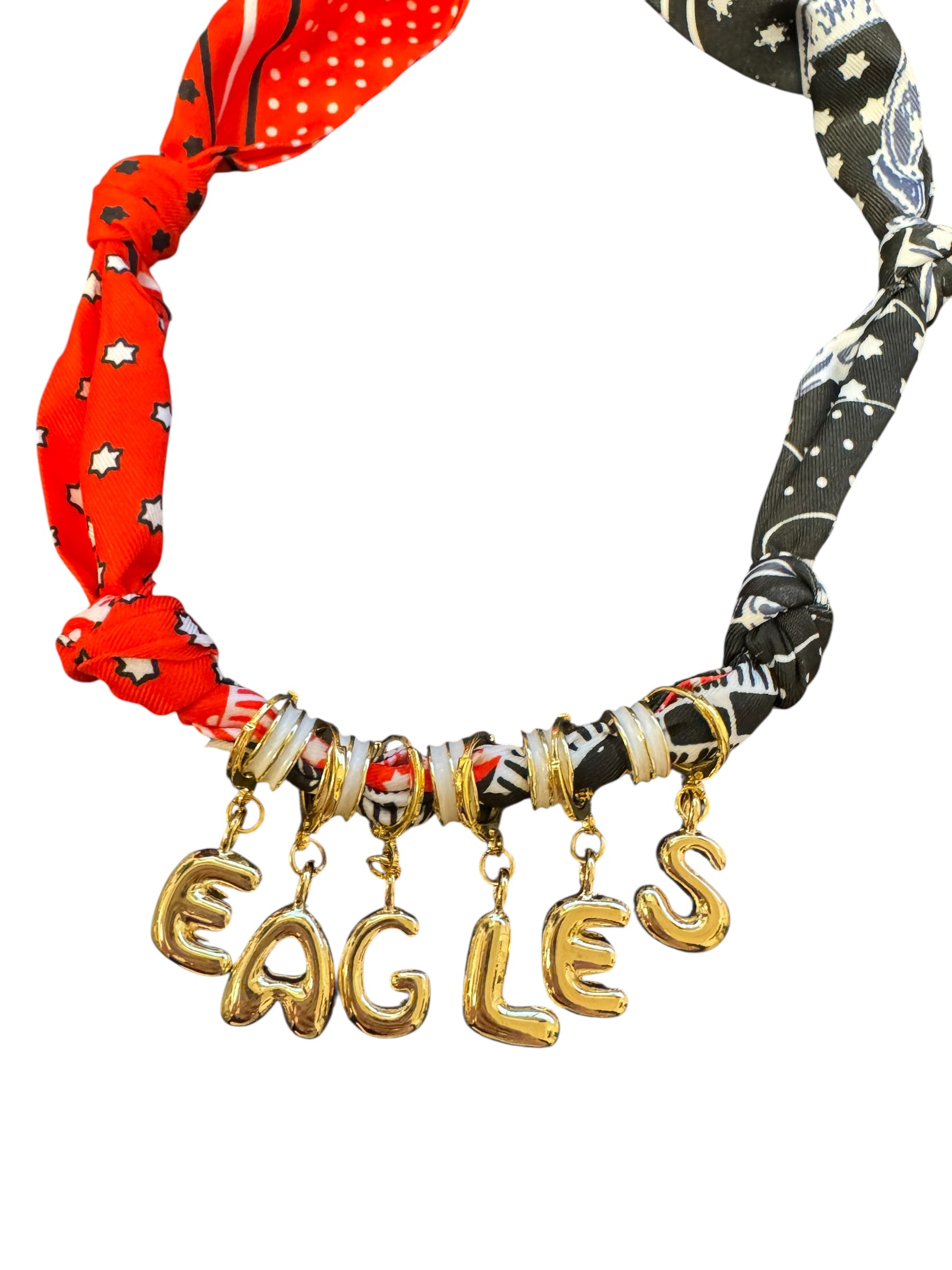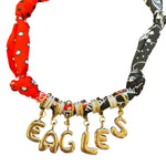 The necklace features bold, 18k gold-plated bubble letters that spell out “EAGLES,” with coordinating white spacers to make the design pop. The soft scarf tie allows for an adjustable fit, making it the perfect accessory for the ultimate fan. Wear it to the big game or any day you want to showcase your team pride!