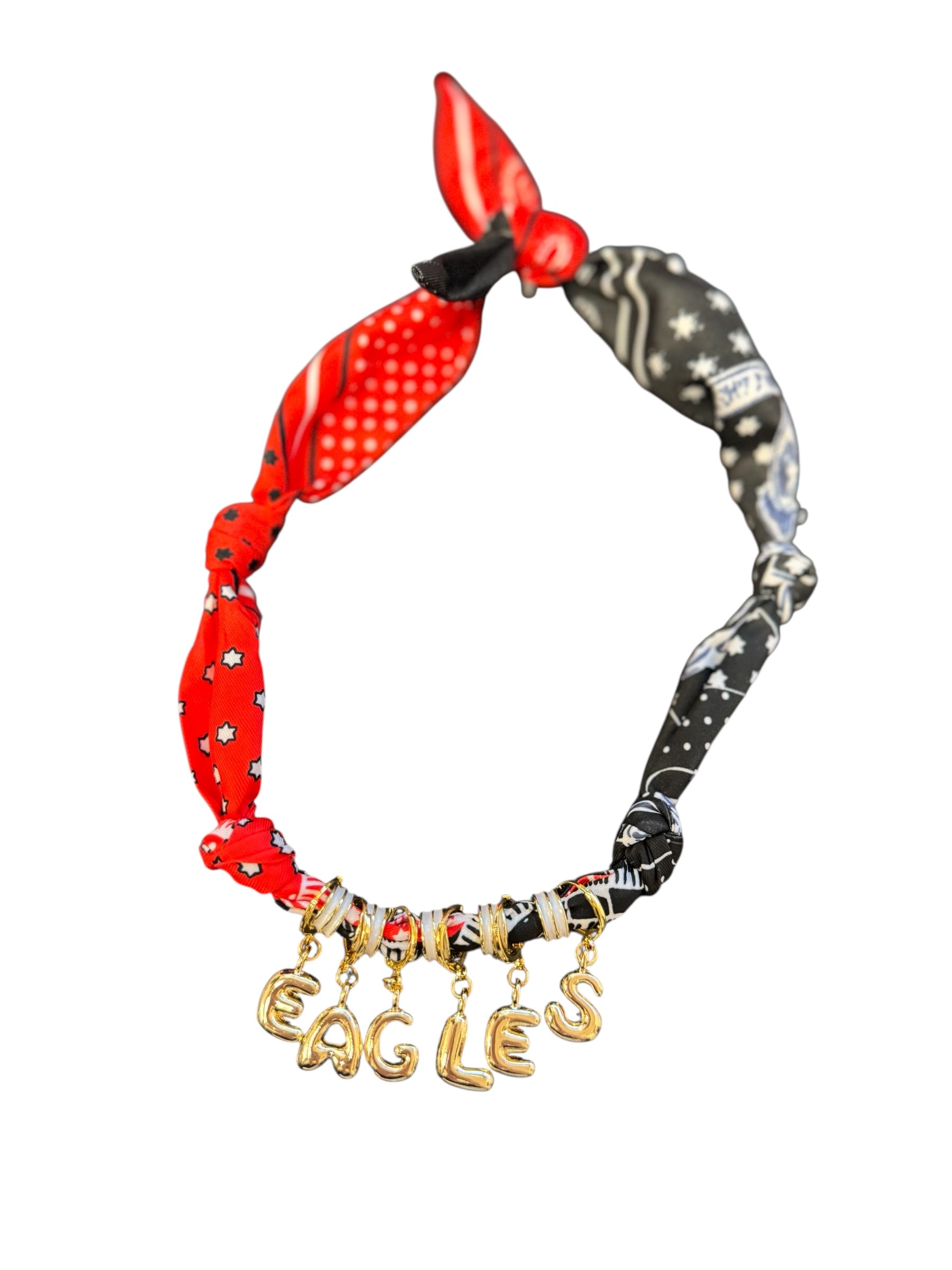 Show off your school spirit in style with our Eagles Game Day Scarf Necklace! This unique accessory combines a bold, vibrant satin scarf in red, white and black with luxe gold details for a fun, spirited look.