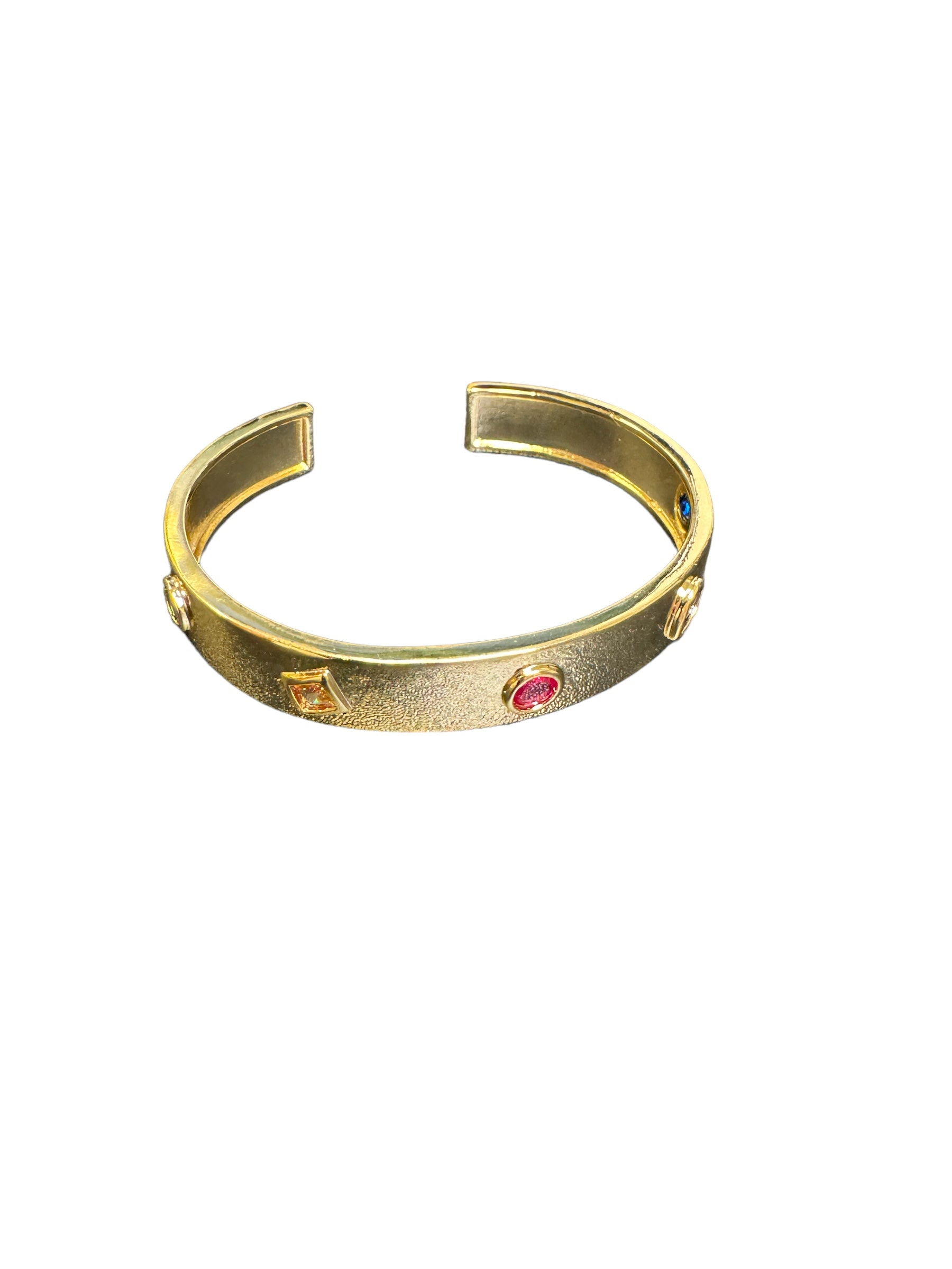 Add some sparkle and shine to your wrist with this Gold Rhinestone Bracelet. The gold cuff serves as a chic base for the colorful rhinestones, creating a playful and glamorous accessory. Perfect for adding a touch of glam to any outfit.