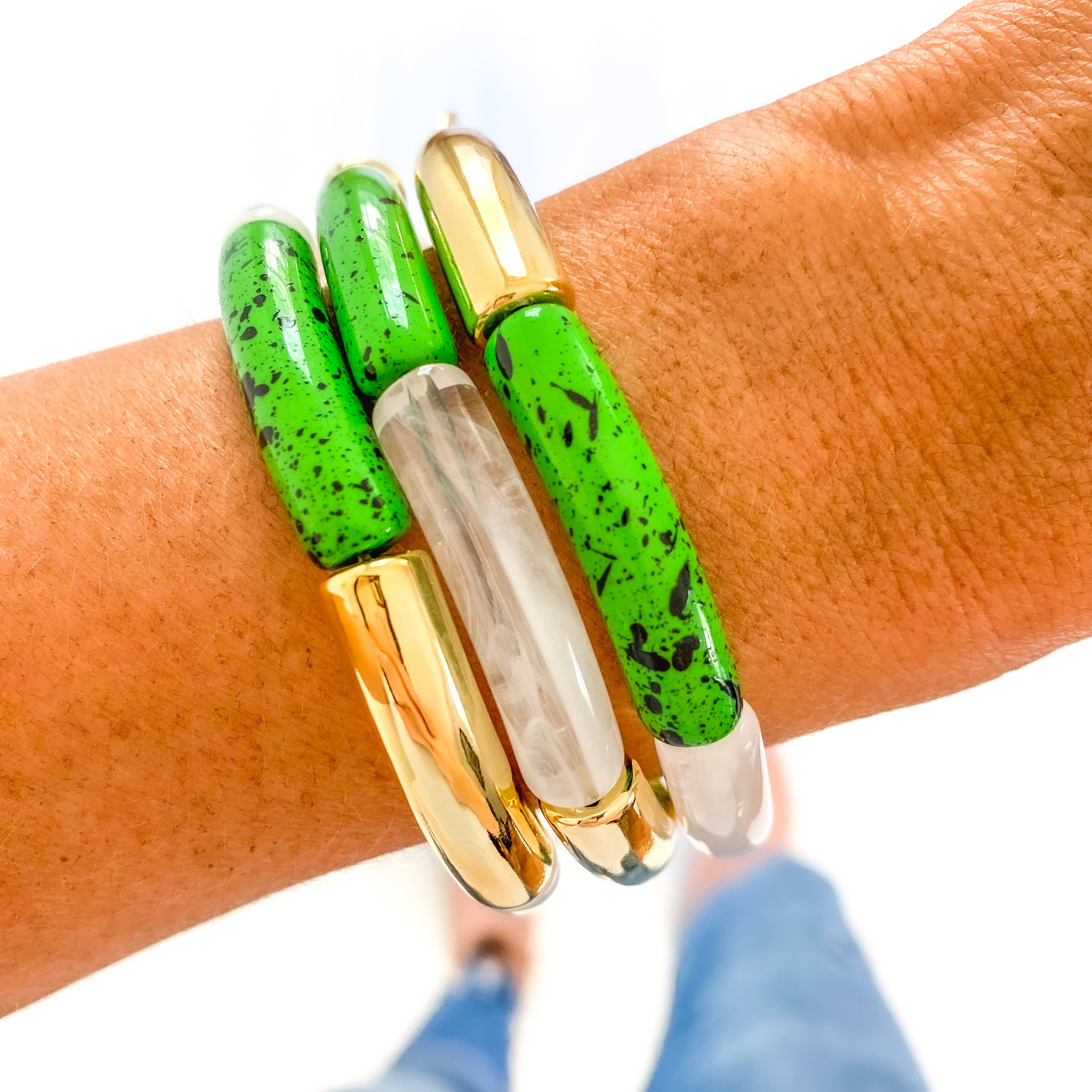 Green Speckle, Gold & White Acrylic Tube Bracelet