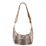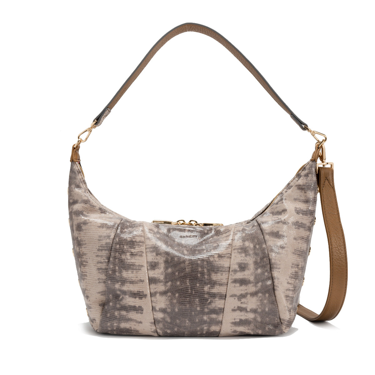 Metallic taupe spotted leather shoulder bag with gold hardware and wide strap