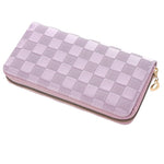 Upgrade your everyday wallet game with the Lavender Checkered Wallet. Made of high-quality vegan leather with a playful checkered monogram design and gold accents, this long wallet is perfect for daily use. It features a smooth zipper closure and plenty of storage space for cash, cards, and coins. Upgrade now!