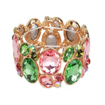 Adorn your wrist with the captivating elegance of our Pink & Green Oval Crystal Bracelet, a stunning accessory designed to infuse your look with vibrant charm. This exquisite stretch bracelet features an opulent arrangement of mixed pink and green oval crystals, meticulously set within a radiant gold metal framework. The harmonious blend of these captivating hues creates a visually striking contrast, ensuring this piece stands out beautifully. Measuring an impressive 1.65 inches wide, its substantial presence makes a bold yet sophisticated statement. Designed for ultimate comfort and versatility, its stretch-to-fit style ensures a perfect and effortless fit for any wrist size, making it an ideal gift or a luxurious addition to your personal jewelry collection.