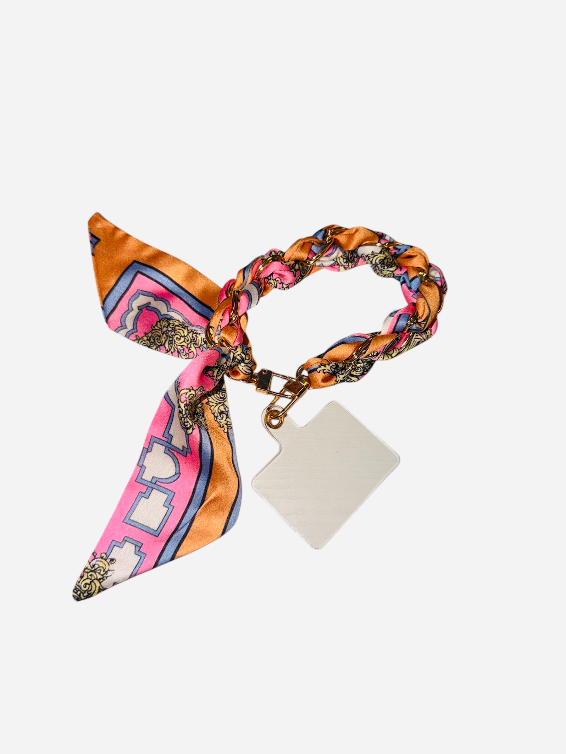 Keep your phone close and your style elevated with the Scarf Phone Holder Wristlet—a chic, functional accessory designed for everyday convenience. This trendy phone strap features a silky scarf woven through a durable gold-tone chain, blending fashion and practicality in one statement piece. The soft, feminine color palette of peachy orange, blush pink, and light blue adds the perfect pop of color to any outfit, making it ideal for both casual days and dressed-up moments.