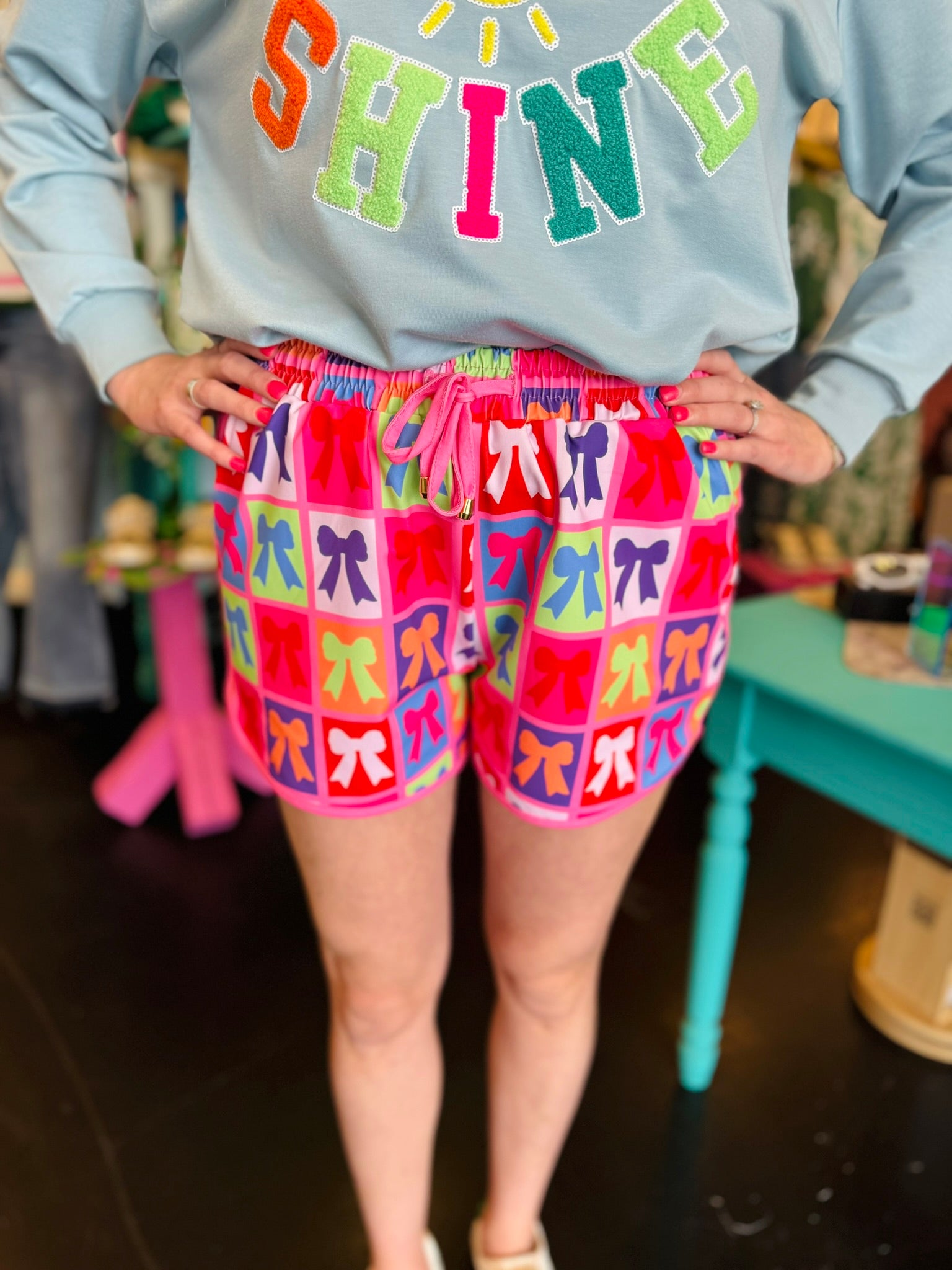 Step into effortless style with our Mid-Rise Bow Print Shorts, the perfect blend of comfort and chic design. These versatile shorts are a go-to for spring and summer but can easily transition into fall with the right layering. Designed with a relaxed fit, they offer comfort without sacrificing style, making them ideal for everything from casual outings to weekend getaways. The playful bow print adds a charming touch, while functional details like pockets and a tie waist drawstring make them practical for everyday wear. Pair them with our Lime Basic Tee for a fun and stylish look that’s easy to love.