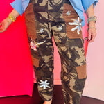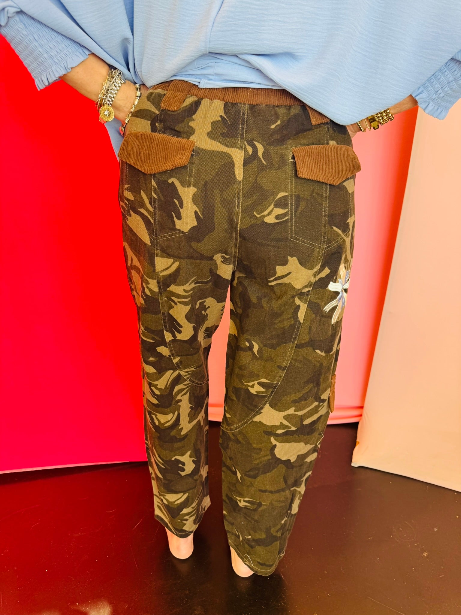 Bring standout style to everyday dressing with our Camo Floral Patch Pants, a chic blend of rugged utility and feminine detail. Crafted from 100% cotton, these pants offer breathable comfort with a soft, lived-in feel perfect for all-day wear. The classic camo print sets the foundation, while embroidered floral appliqués add an unexpected pop of color and charm, giving the design a boutique-worthy twist. Contrast corduroy patch pockets elevate the utilitarian look with rich texture and practical function. An easy pull-on elastic waistband ensures comfort and flexibility, making these pants ideal for casual outings, errands, or creative styling moments. Pair them with relaxed tees, fitted tops, or cozy sweaters for a look that’s effortlessly cool and uniquely expressive.