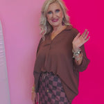 The Chocolate Checkered Skort, with its comfy built-in shorts, flattering fit, and trendy checkered print will be your wardrobe go-to—plus, brown is the must-have color of the fall season!