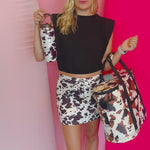 Step into playful style with our Cowhide Couture Skort, designed to bring a bold twist to your wardrobe. Featuring a trendy cow print pattern, this skort perfectly balances fashion and function. The elastic drawstring waistband ensures a flattering, customizable fit, while the built-in shorts let you move freely with confidence. Side pockets add convenience for stashing your essentials, and the stretchy, lightweight fabric keeps you comfortable all day long.