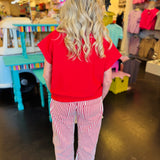 A red front rope tie threaded through metal eyelets adds an eye-catching, trendy touch. Decorative front pockets complete the look with stylish flair, making these pants a versatile statement piece for any wardrobe. Whether paired with a tucked-in blouse or a casual tee, these pants are ready to elevate any outfit.