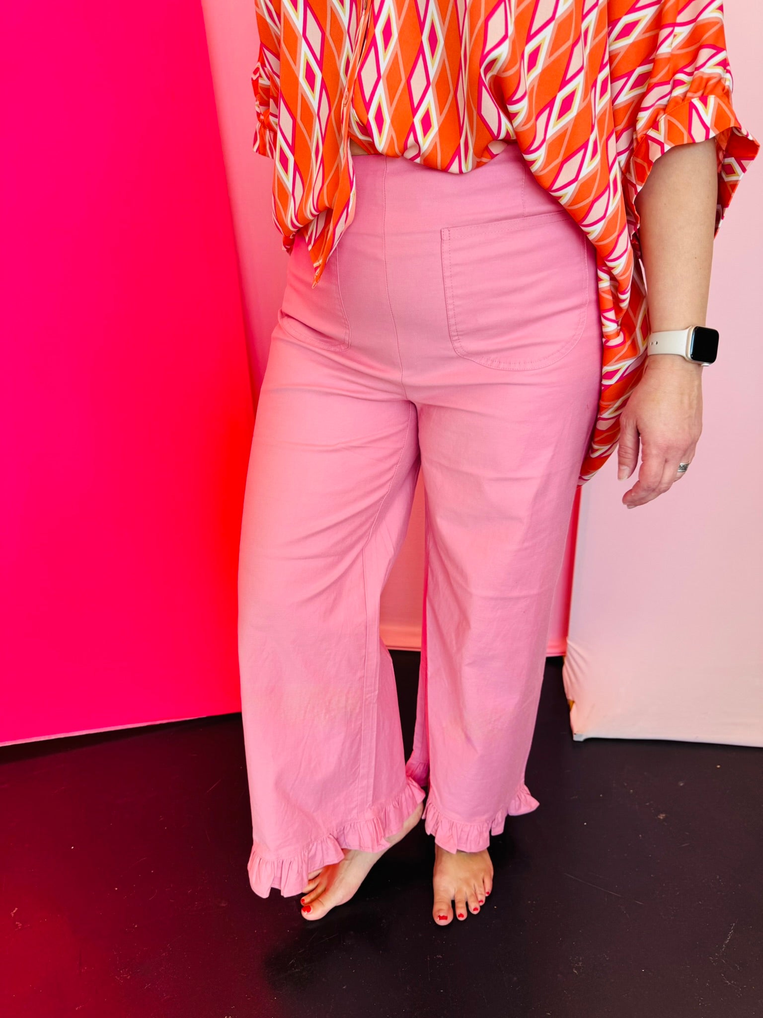 A straight-leg shape keeps the style classic and versatile, while the delicate ruffled hem adds feminine flair that elevates any outfit. Pair them with blouses, sweaters, or tucked-in tees for an effortlessly stylish look that transitions seamlessly from daytime outings to evenings out. Fun, flattering, and fashion-forward, these pink pants offer a perfect blend of charm and sophistication.