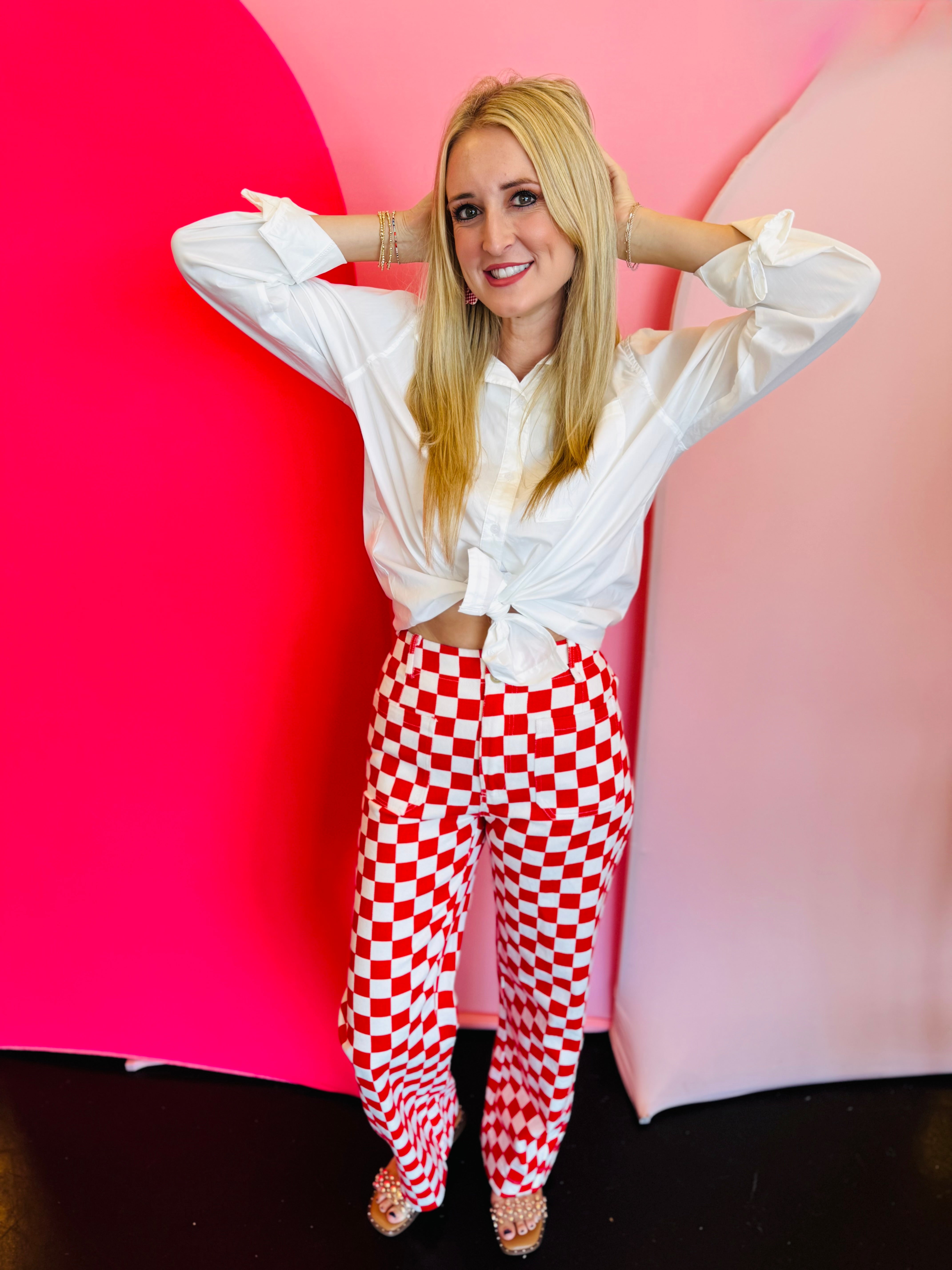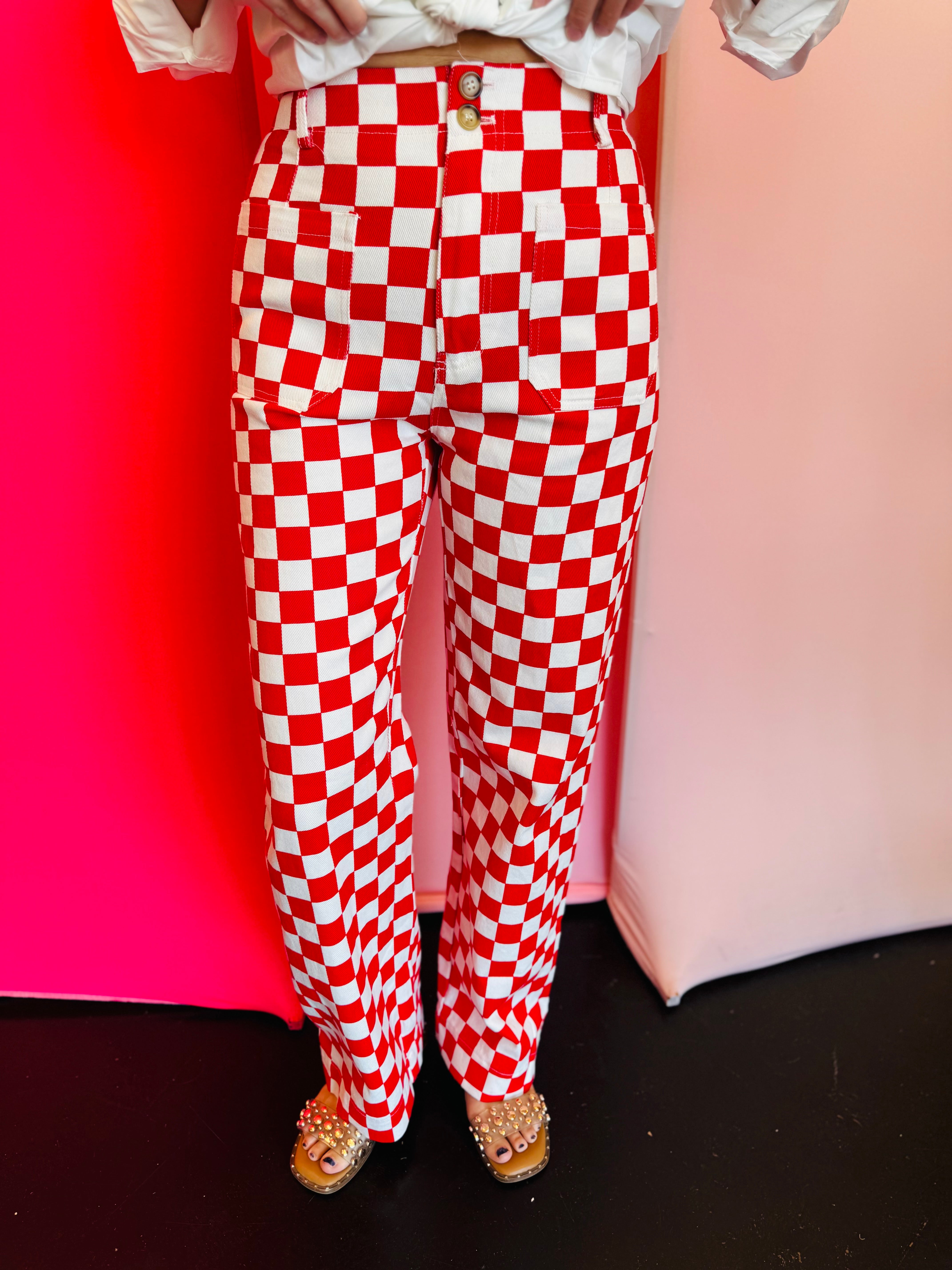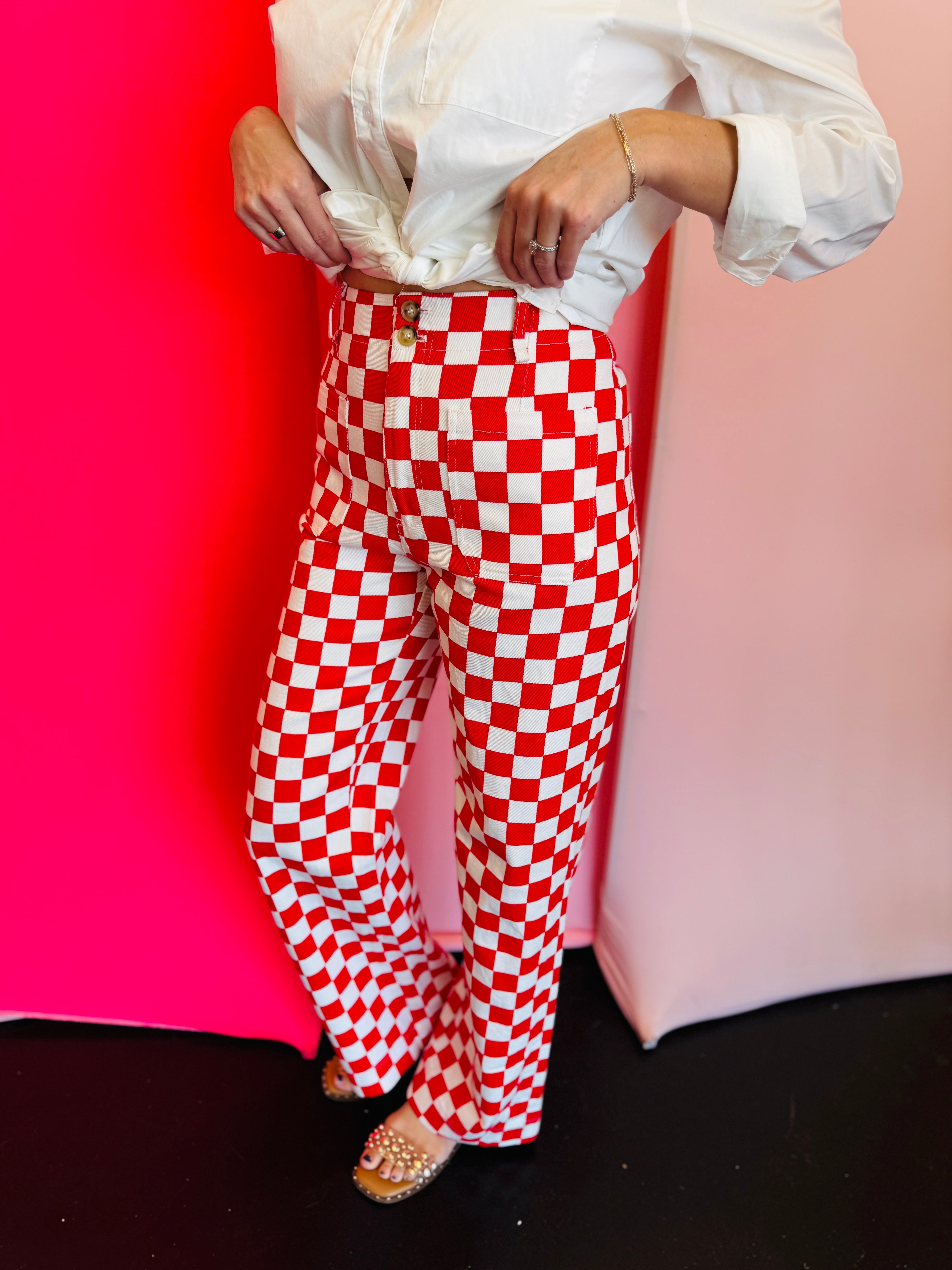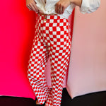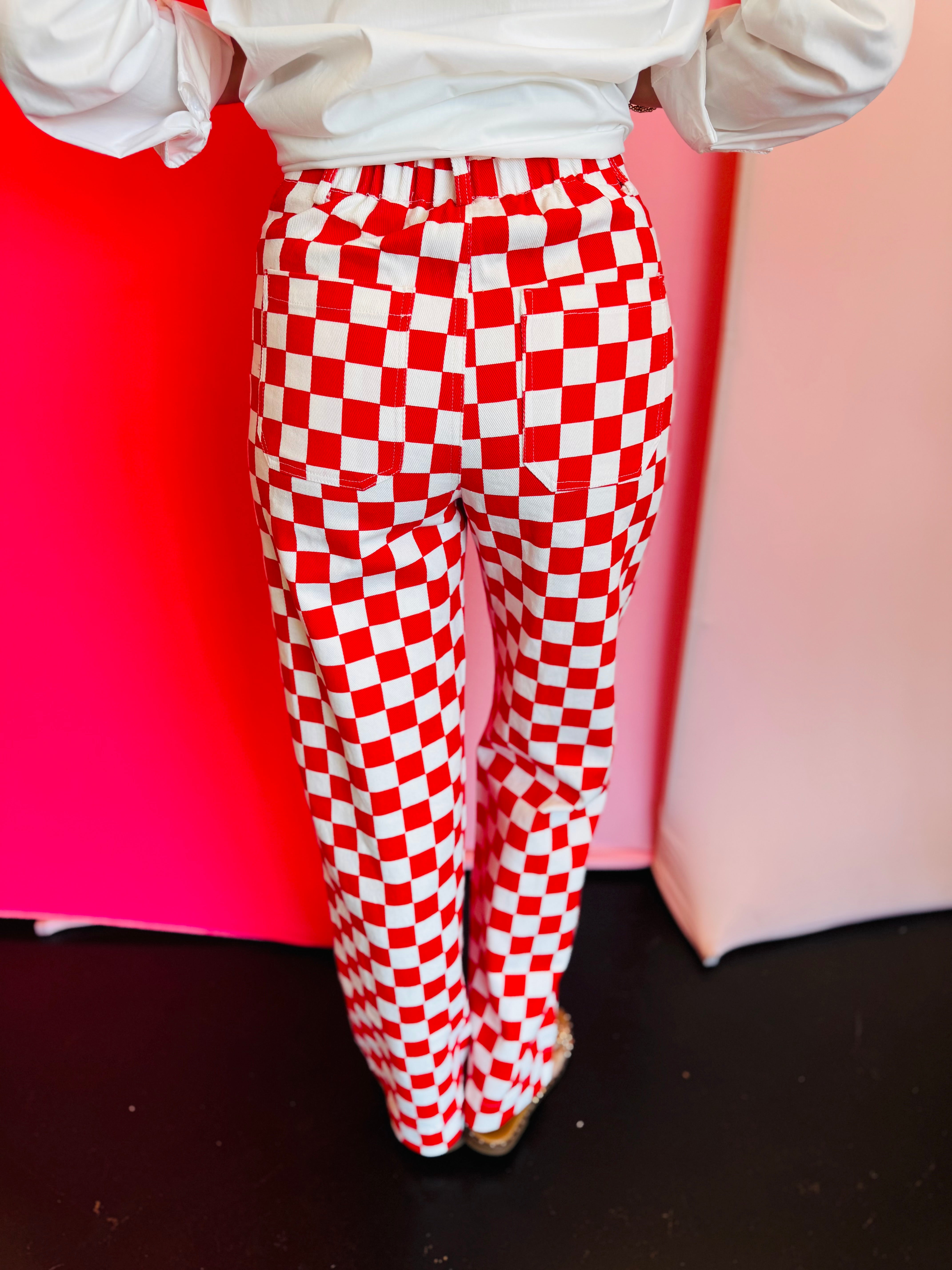 Elevate your casual wardrobe with our striking Red Demi Checkered Jeans, offering a blend of comfort and contemporary style. These wide-leg Demi Checkered Bottoms feature a flattering high-waist design and a relaxed straight fit, ensuring both ease of movement and a chic silhouette. The distinctive red and white gingham print adds a playful yet sophisticated touch, perfect for making a statement. Crafted from 100% cotton, these jeans promise breathable comfort and lasting quality. Designed with an elastic waistband for an impeccable fit and front patch pockets for added utility and style, they are ideal for everyday wear, effortlessly pairing with your favorite tops for a fashion-forward look.