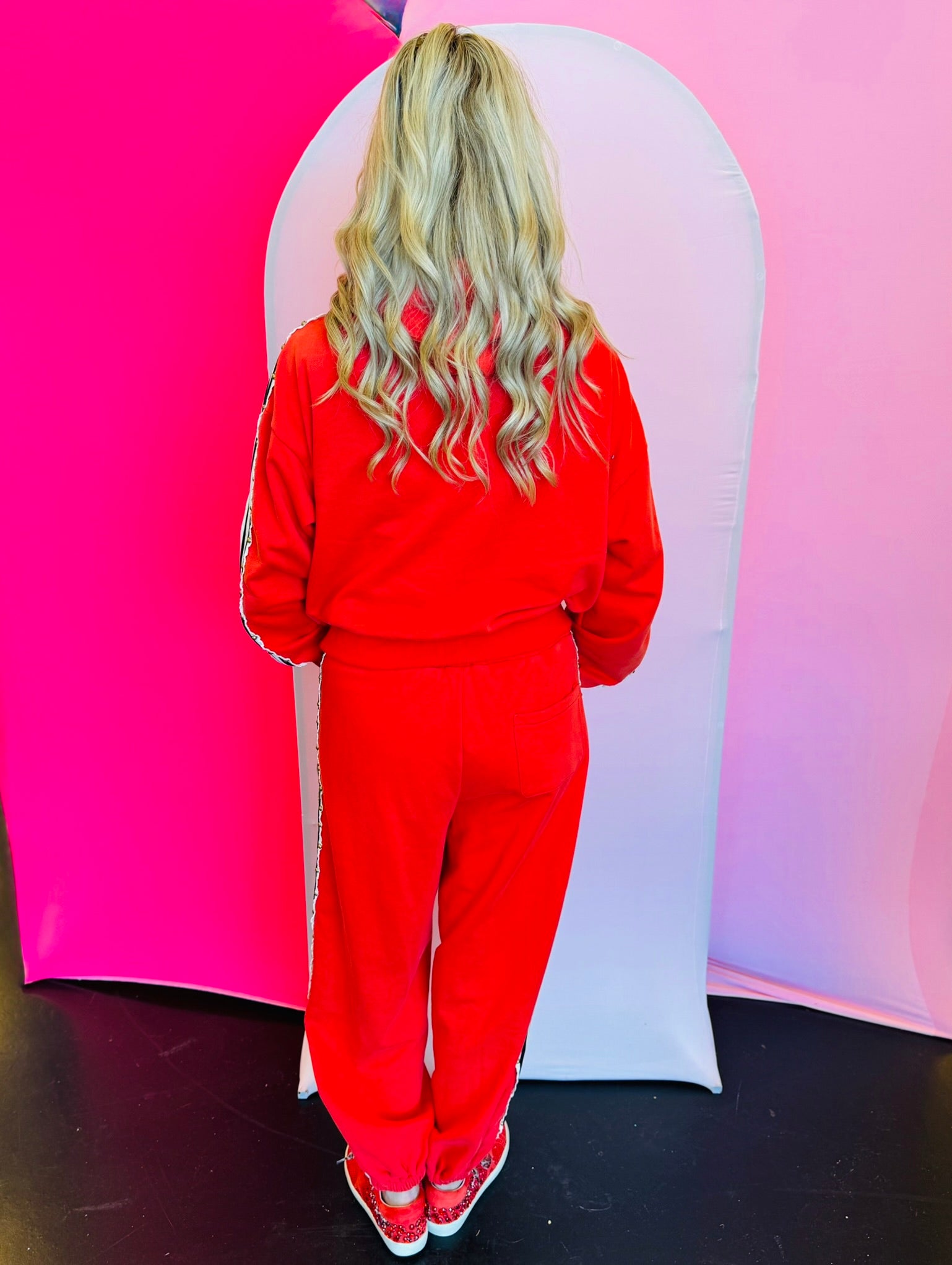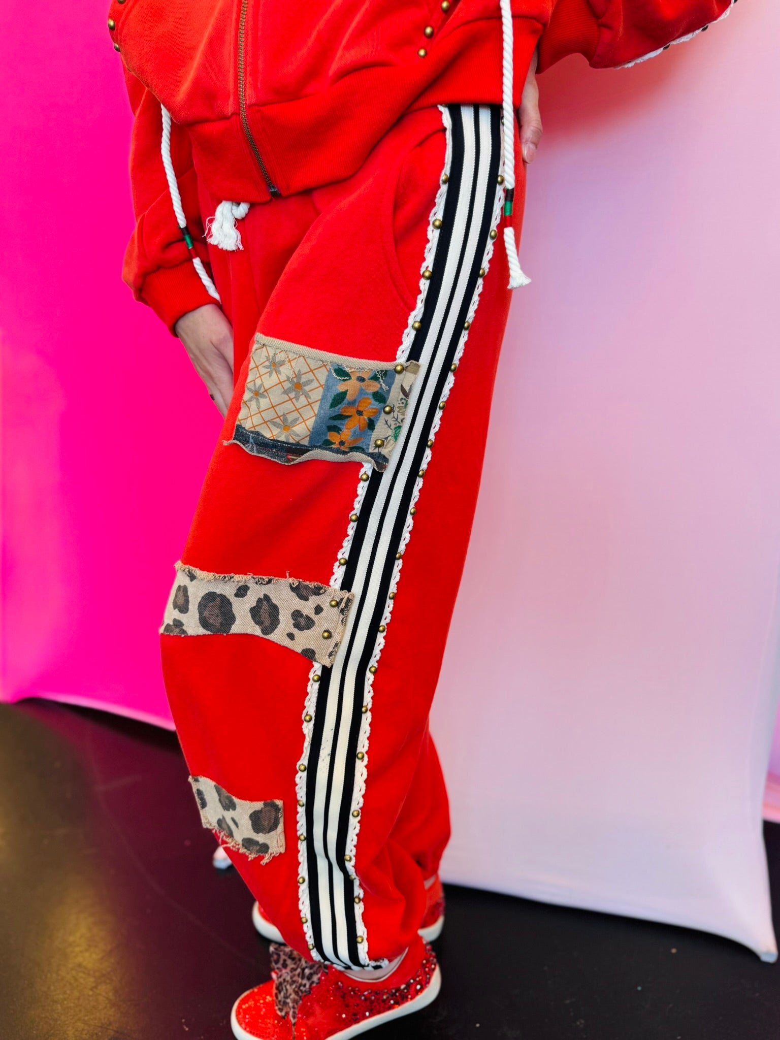 Make a vibrant statement with our palazzo style Red & Leopard Sweatpants! These bold track pants are designed in a roomy fit and crafted from soft French terry for ultimate comfort. They feature eye-catching sporty side stripes with unique studded elastic detailing. Asymmetrical contrast patches, some with edgy animal print accents, add an unexpected wild touch. Perfect for lounging or making a bold fashion statement, these sweatpants blend athletic inspiration with unique, fashion-forward design.