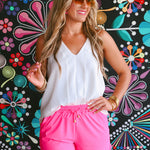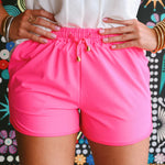 These mid-rise solid neon pink shorts are so perfect for the spring and summer and even to wear in to the fall! Get the effortless yet chic look with these shorts. They feature a mid-rise, tie waist drawstring, & side pockets. These are a relaxed fit.
