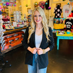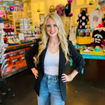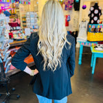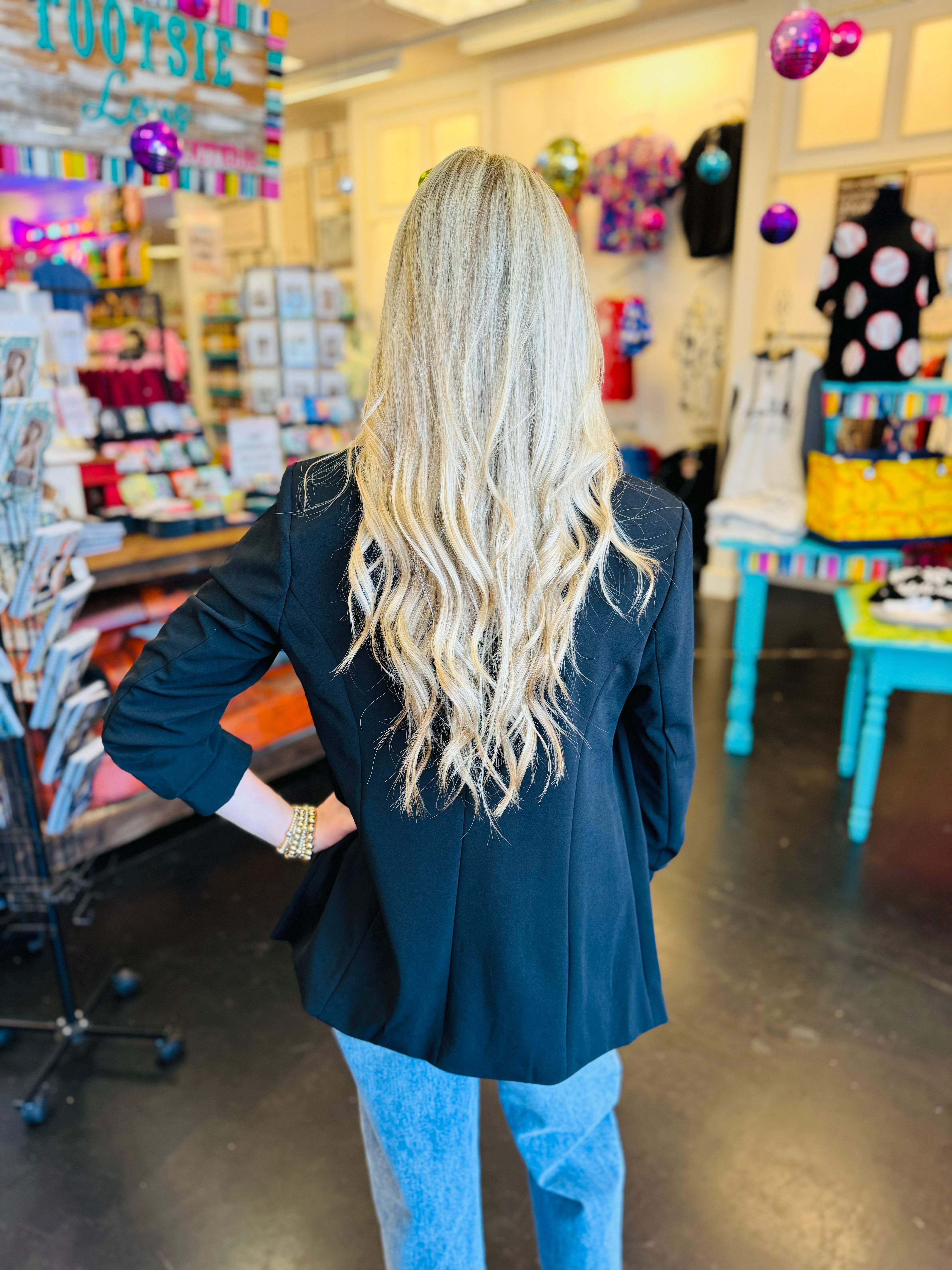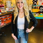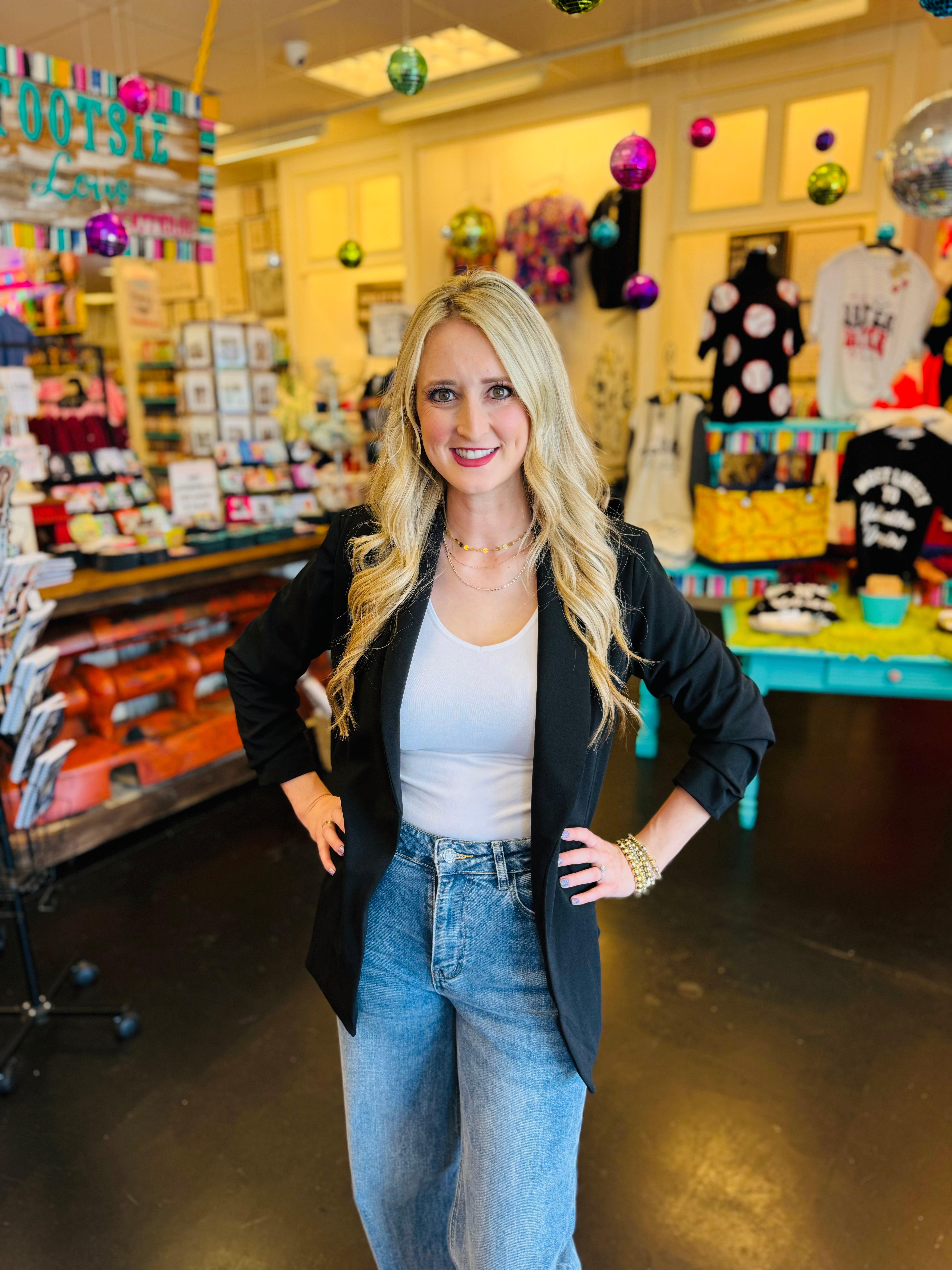 Add some fun and fashion to your wardrobe with this Black Scrunch Sleeve Blazer! The stretchy material ensures a comfortable and flattering fit, while the scrunch sleeves add a unique and playful twist to a classic blazer. Elevate any outfit with this quirky and versatile piece. Year round closet staple!
