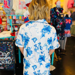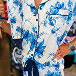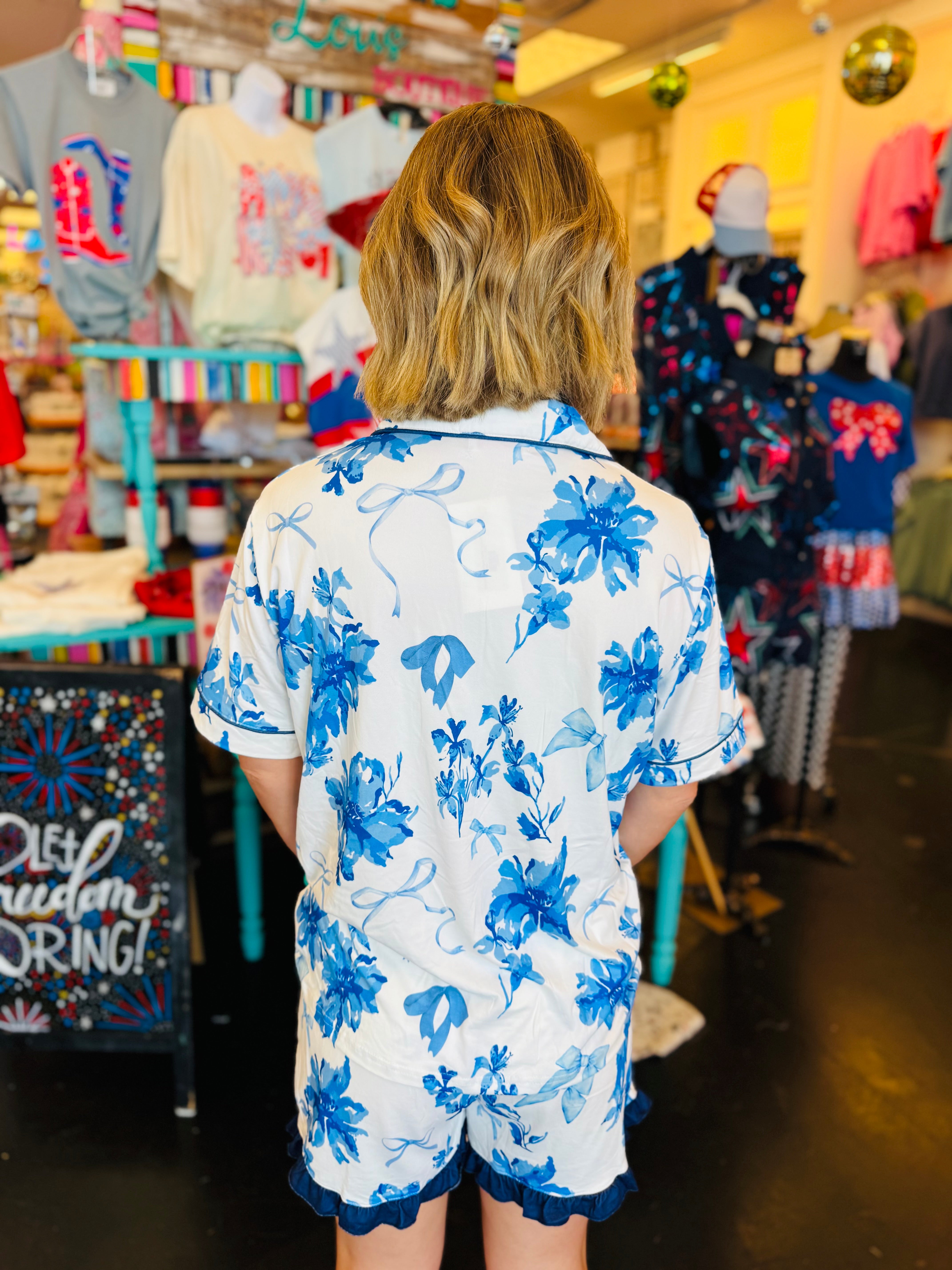 Lounge in style with our Blue Blossom Ruffle Pajama Set. Featuring our trendiest print, button up top, and playful ruffle shorts with a decorative tie. Get ready for a comfortable and fun night's sleep!