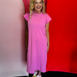 You'll love our soft and stylish Candy Pink Short Sleeve Midi Dress. It's a not-so-basic staple, featuring a flattering round neckline and a comfortable stretch cotton blend. A subtle side slit provides extra movement and style. This is a closet must-have for effortless everyday looks, offering a versatile foundational piece you can wear for any occasion, from casual days to evening outings. Add a trendy scarf necklace to elevate your look!