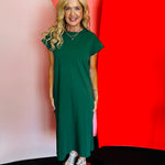You'll love our soft and stylish Dark Green Short Sleeve Midi Dress. It's a not-so-basic staple, featuring a flattering round neckline and a comfortable stretch cotton blend. A subtle side slit provides extra movement and style. This is a closet must-have for effortless everyday looks, offering a versatile foundational piece you can wear for any occasion, from casual days to evening outings. Add a trendy charm scarf necklace to elevate your style.