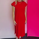 You'll love our soft and stylish Red Short Sleeve Midi Dress. It's a not-so-basic staple, featuring a flattering round neckline and a comfortable stretch cotton blend. A subtle side slit provides extra movement and style. This is a closet must-have for effortless everyday looks, offering a versatile foundational piece you can wear for any occasion, from casual days to evening outings. Add a trendy charm scarf necklace for an elevated look!