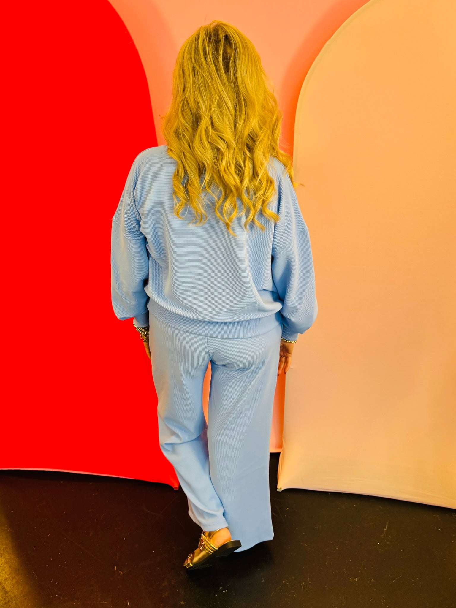 Two-piece cornflower blue ribbed knit set with pullover and pants