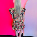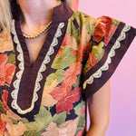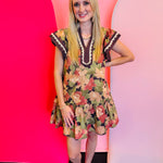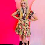 Embrace autumnal elegance with our Brown Floral Flutter Sleeve Mini Dress, a stunning piece that captures the essence of the season. This mini dress showcases a rich, earthy-toned floral print, evoking a warm and inviting aesthetic. The delicate flutter sleeves add a touch of feminine grace, while the scallop inset contrast accent V-neck band enhances its sophisticated charm. Designed with practical side pockets and a tiered hemline, this dress seamlessly blends style with convenience. Fully lined, woven, and non-sheer, this lightweight dress ensures breathable comfort and a beautiful drape for any occasion, from casual outings to more refined gatherings.