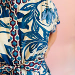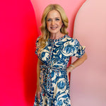 Step into effortless elegance with this Blue Floral Print Tiered Dress, a stunning maxi dress perfect for any occasion. Featuring a bold blue and white tile-inspired print, it exudes a fresh, captivating aesthetic. The dress is designed with a graceful half-button placket and contrasting print accents, adding intricate detail. Short sleeves offer comfort, while the belted waist cinches beautifully to create a flattering silhouette. A flowing tiered skirt cascades elegantly, providing graceful movement and a sophisticated finish. This dress seamlessly blends vibrant patterns with a relaxed, yet refined, form for a truly standout look.