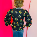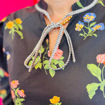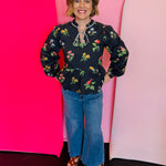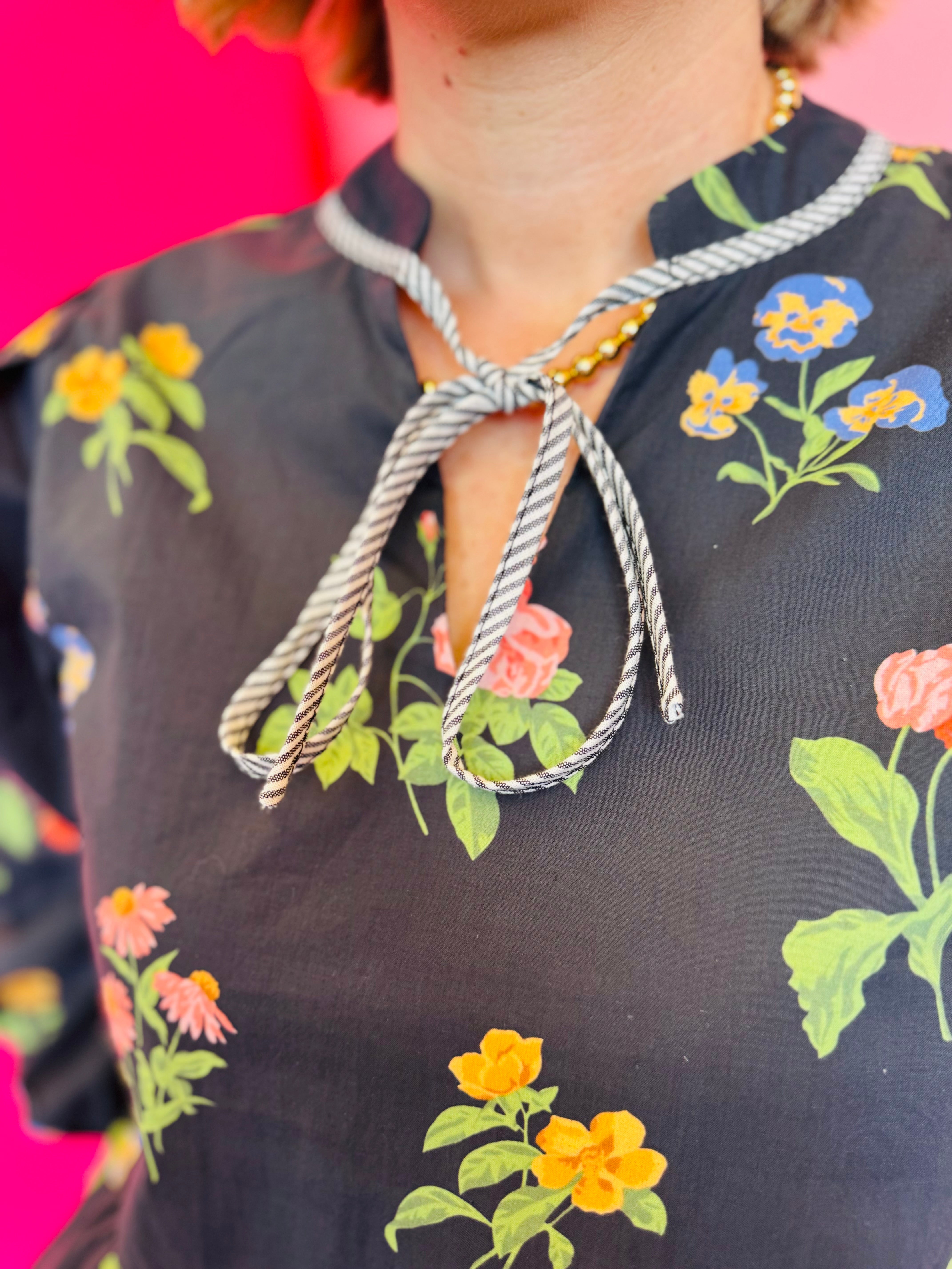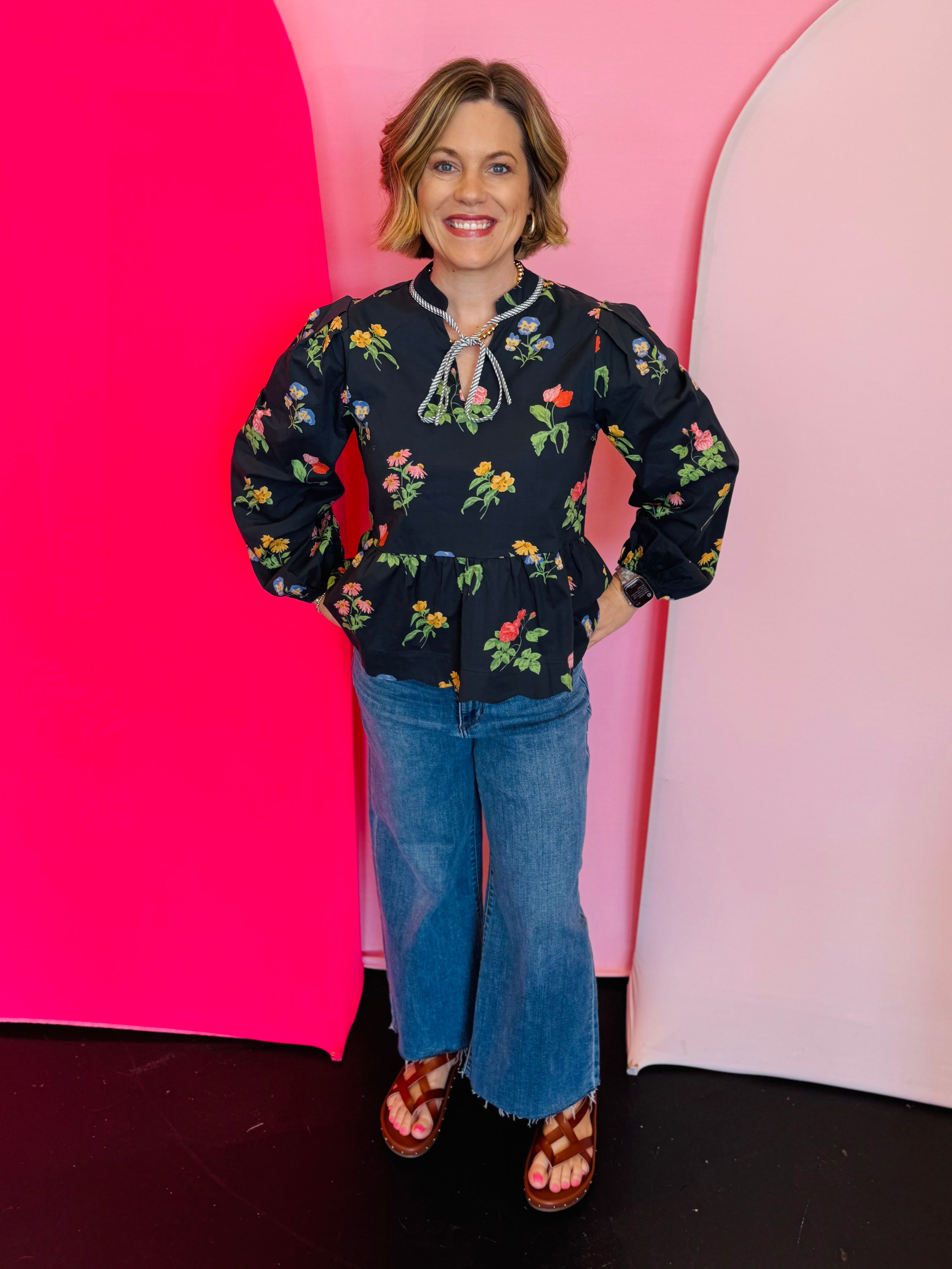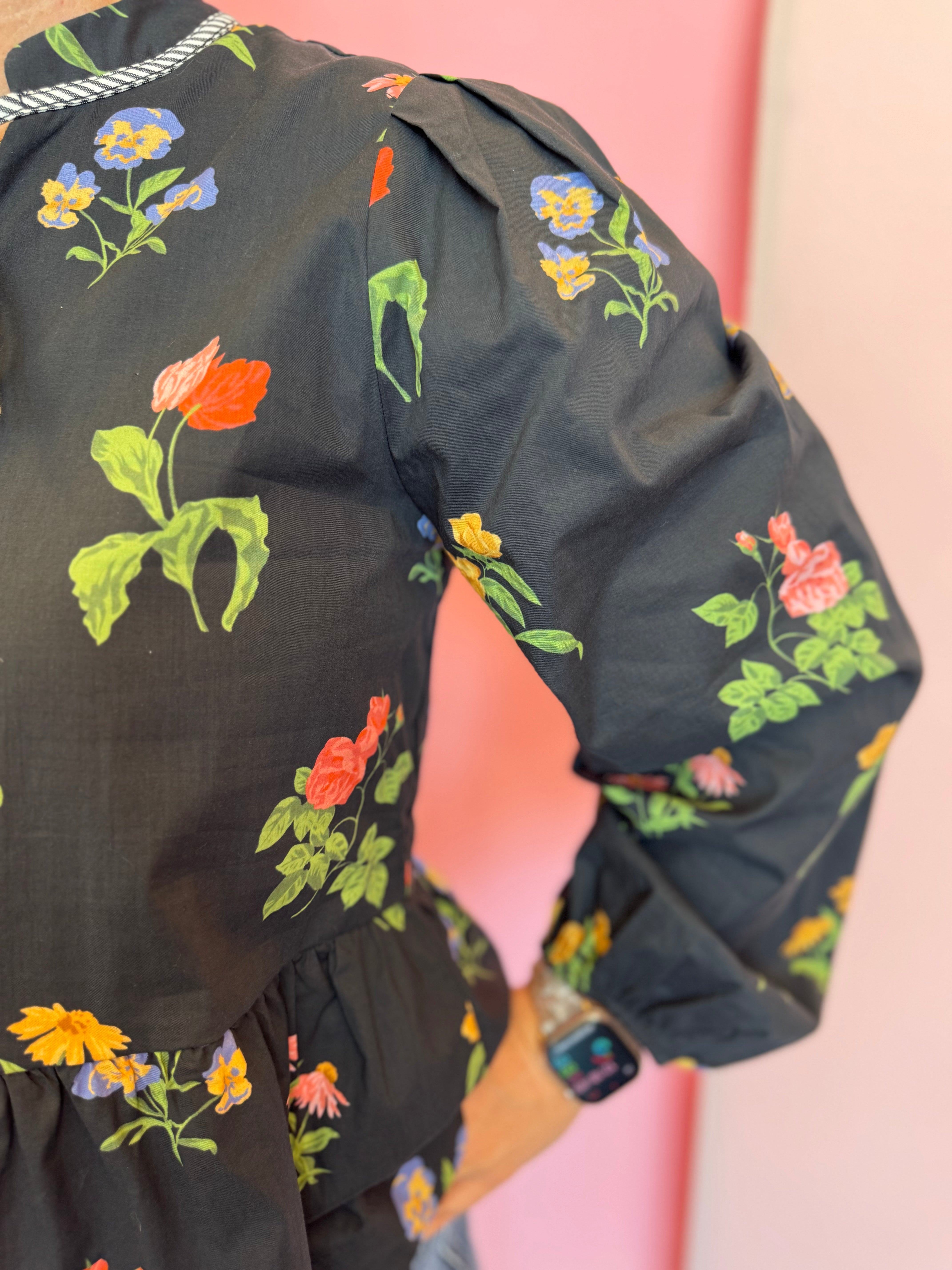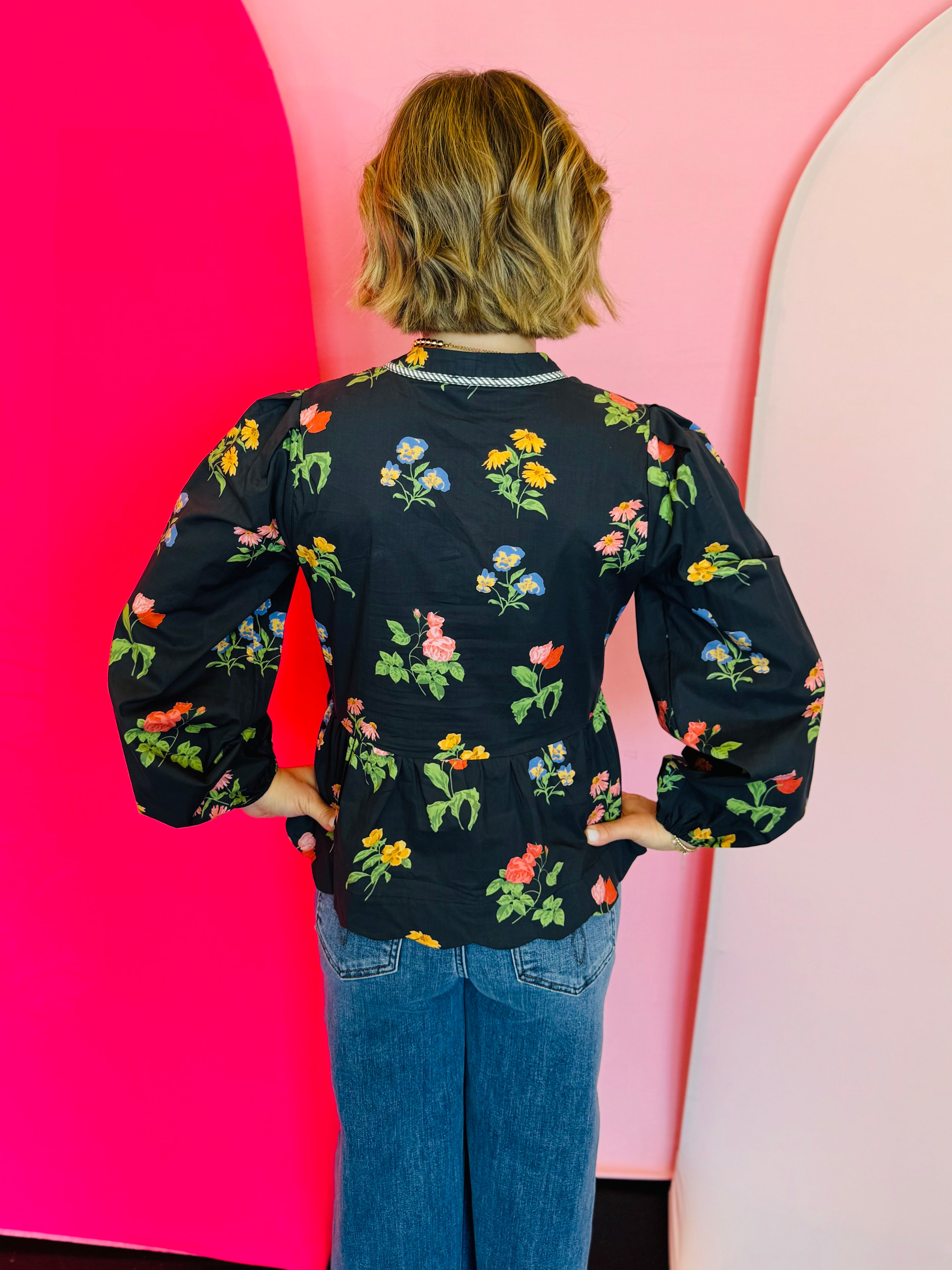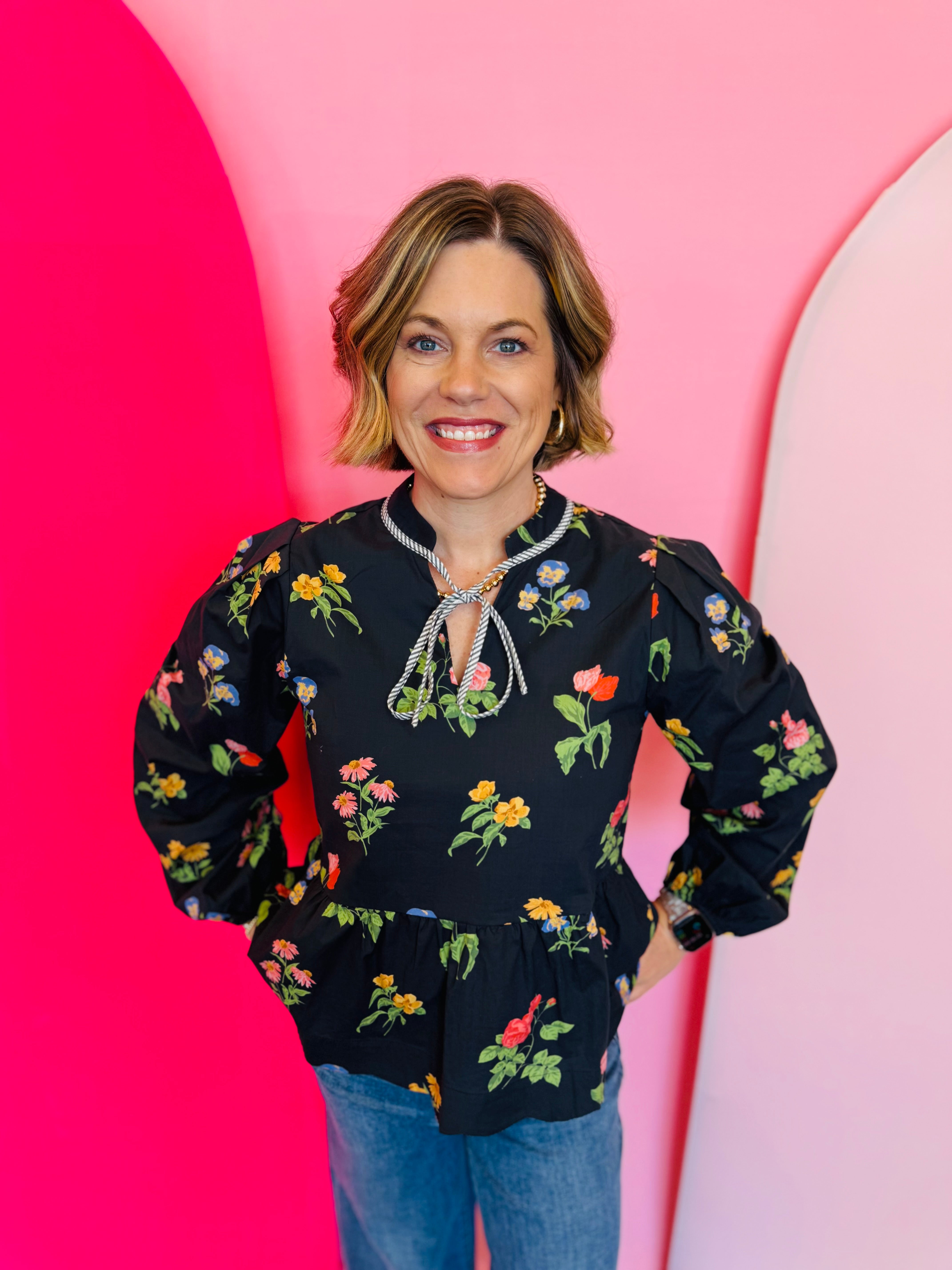 Bring effortless elegance to your wardrobe with the Black Floral Top, a charming blend of color, texture, and feminine detail. This long-sleeve floral peplum blouse features a black backdrop adorned with vibrant, colorful blooms, creating a timeless yet lively aesthetic. The gathered neckline with a tie closure and subtle ruffle trim adds a touch of romance, while the puff sleeves and scalloped hem enhance its soft, flattering silhouette. Finished with a striped contrast string detail at the waist, this top pairs beautifully with jeans, skirts, or tailored pants for a polished yet playful look. Crafted from 100% cotton, it’s lightweight, breathable, and perfect for all-day wear.