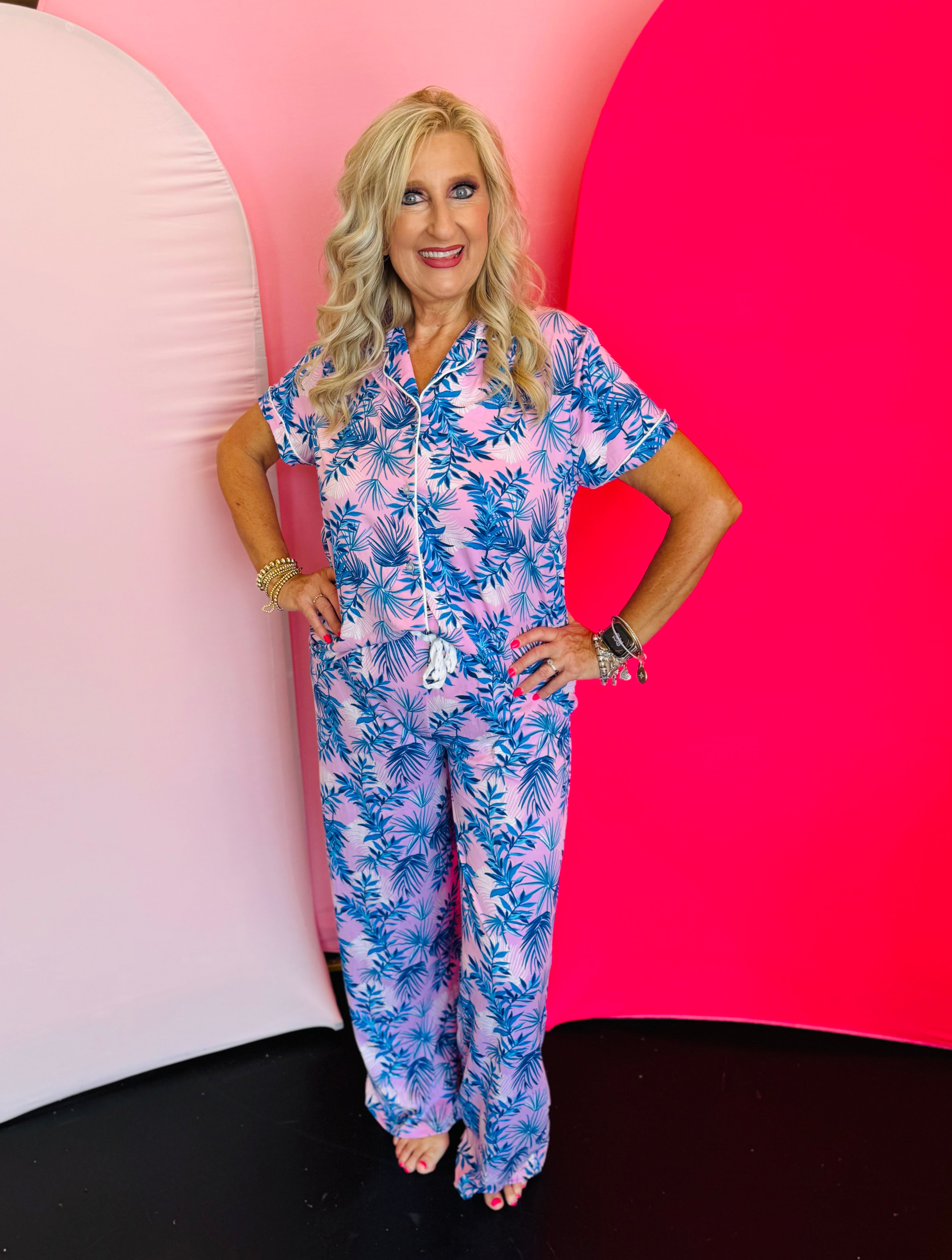 Get ready to kick back and relax with the Hello Mello Palm Down Top. Made with ultra soft, stretchy fabric, this classic button-down style features a relaxed fit and stylish piping detail. Mix and match with pants or shorts for the ultimate lounging experience. Machine washable for easy care.