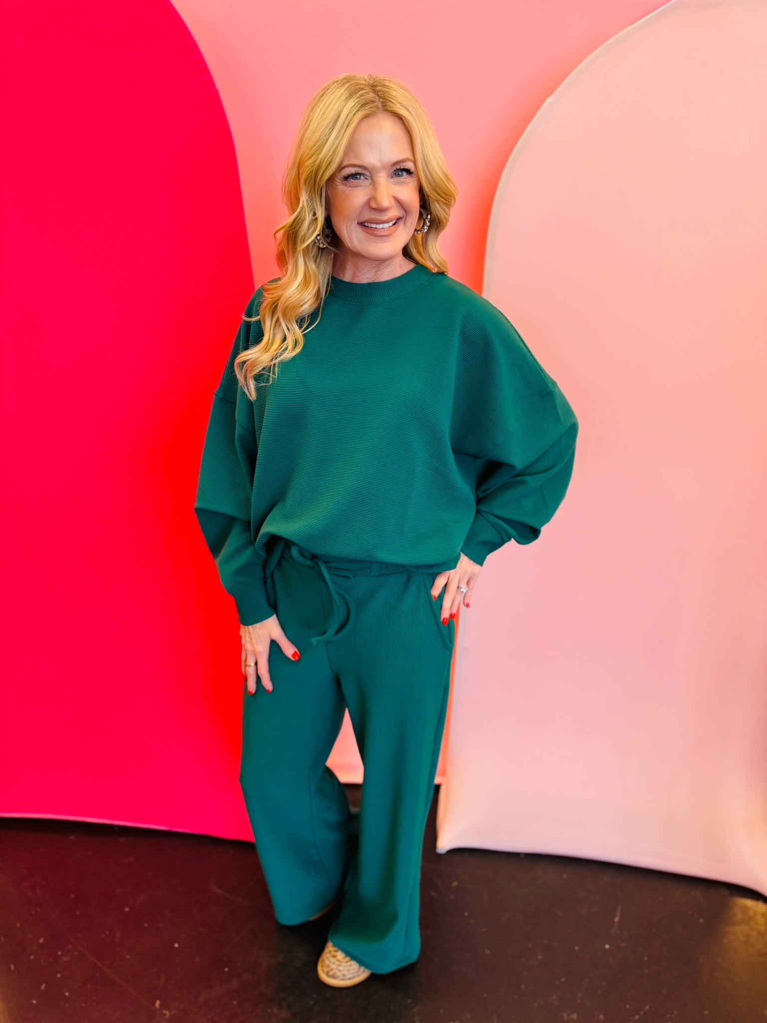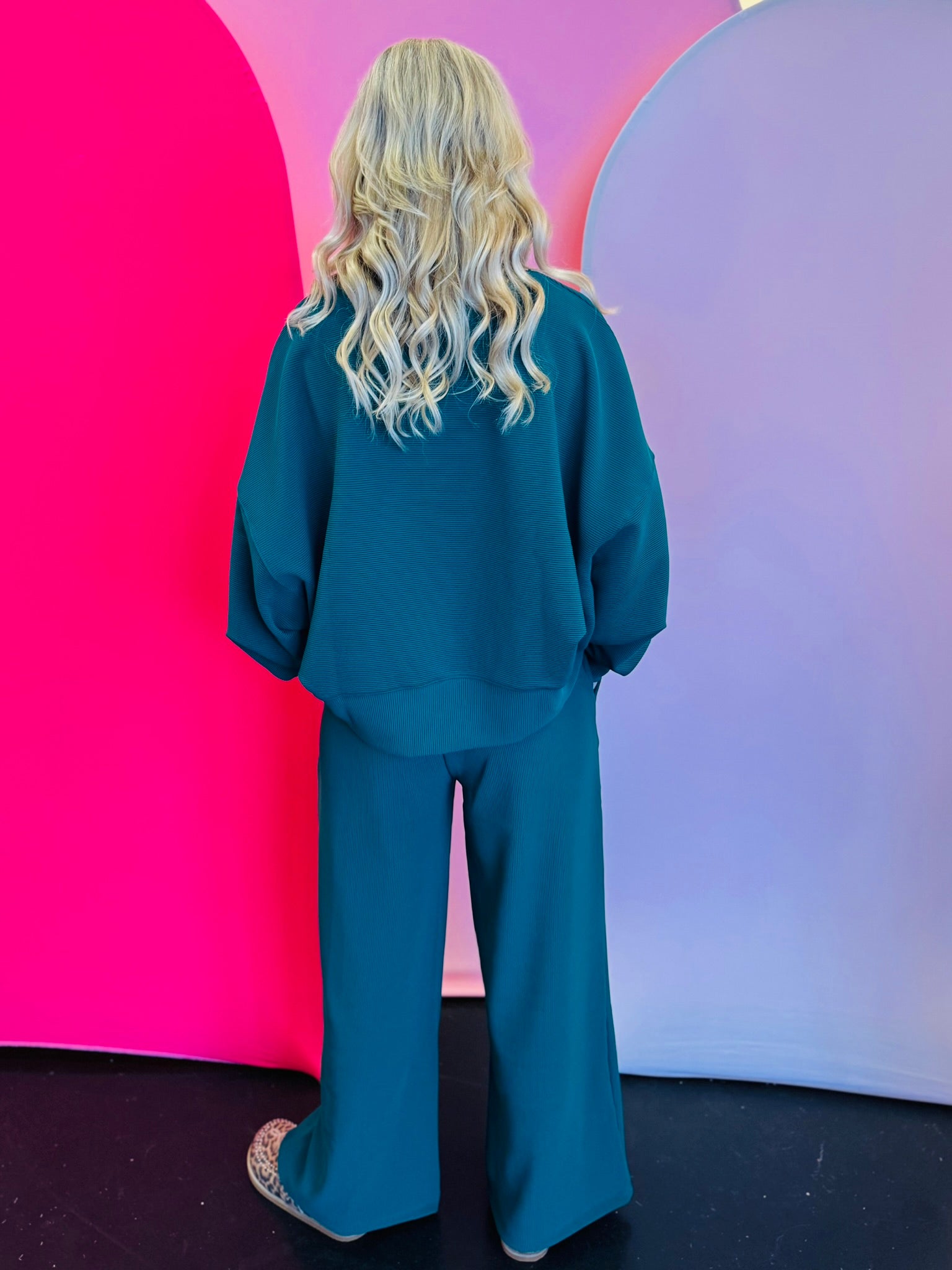 This ribbed pullover pant set features a dolman-sleeved top with a comfortable, flowy, oversized fit—size down if you prefer a more tailored silhouette.