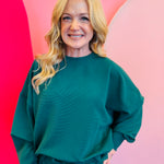 Two-piece hunter green ribbed knit set with pullover and pants