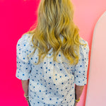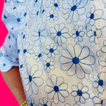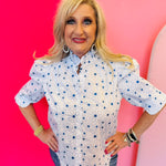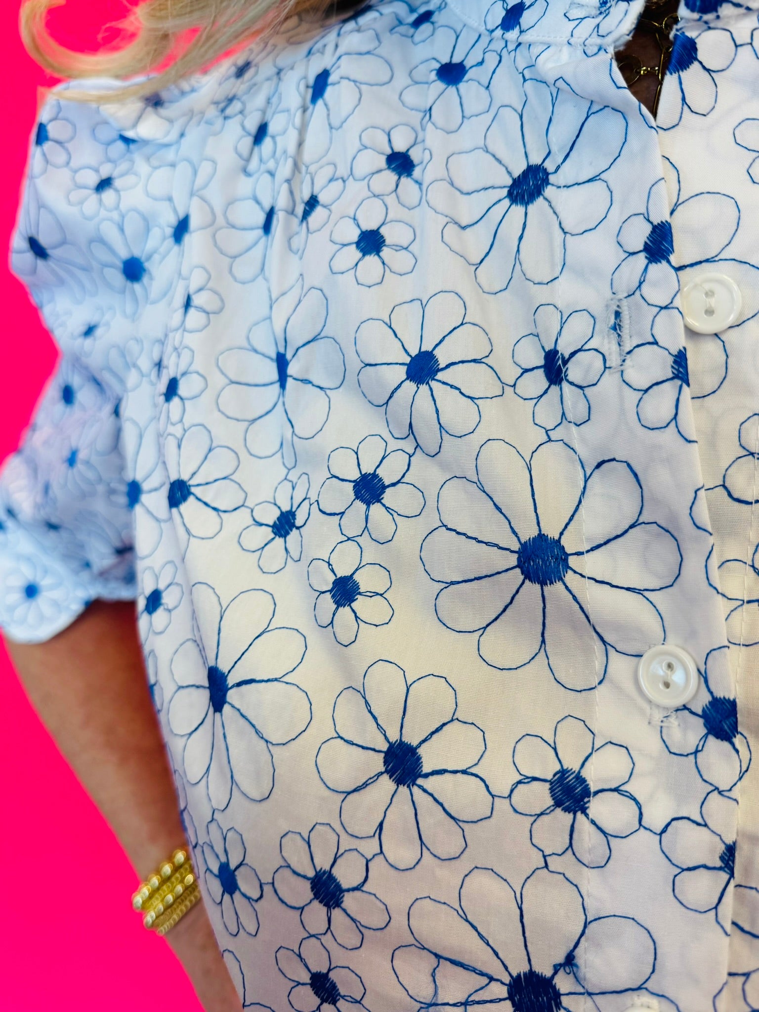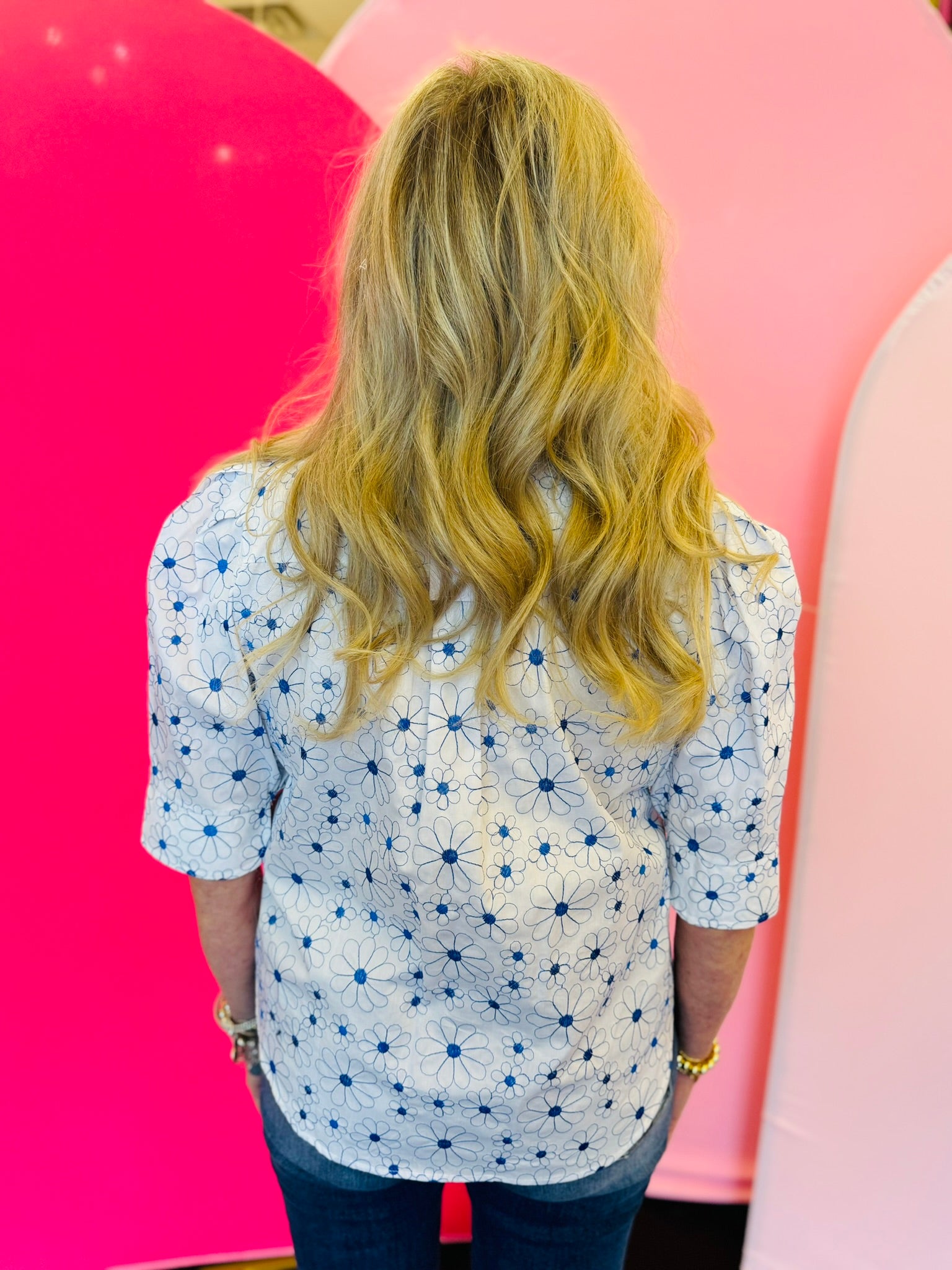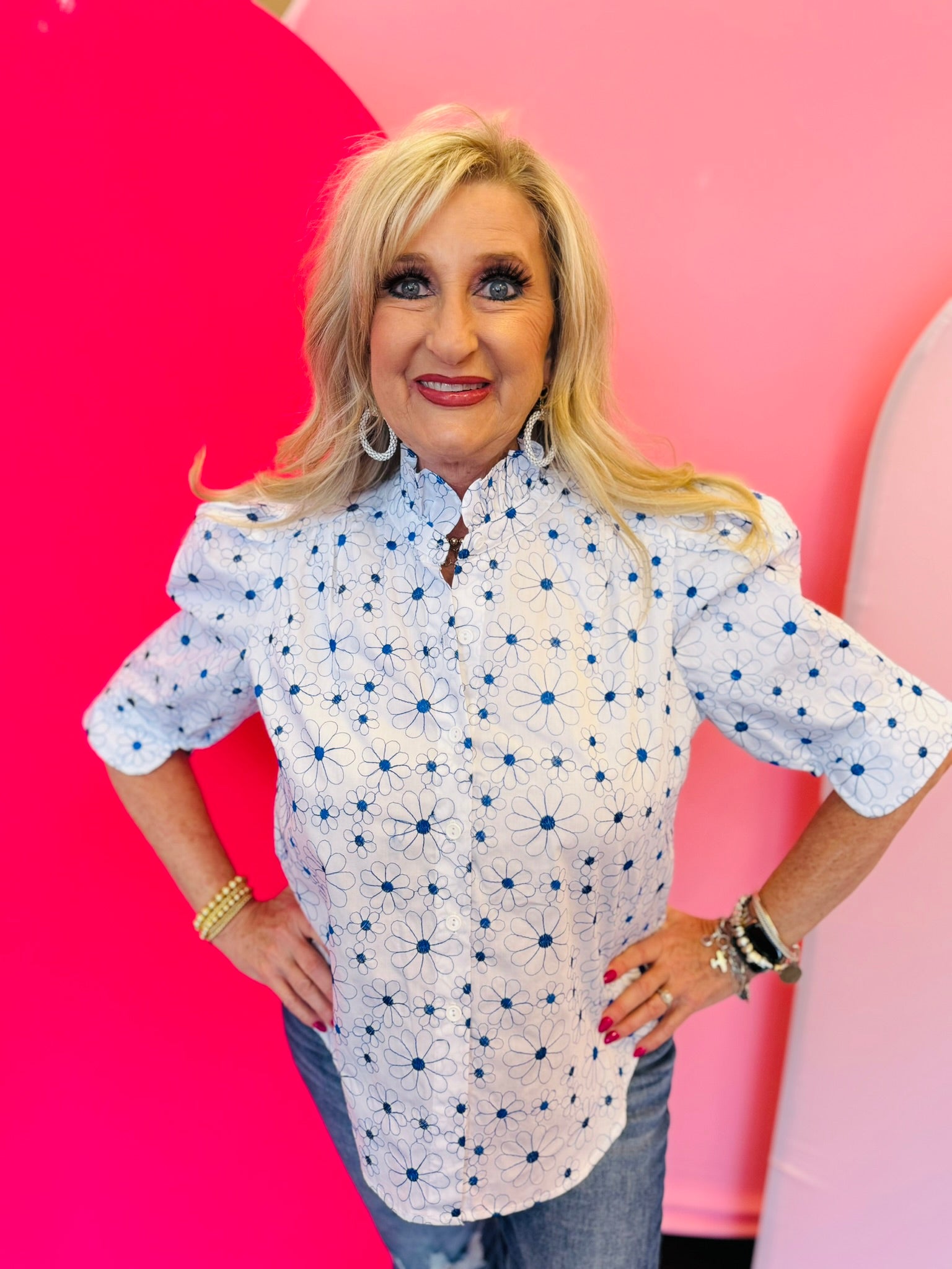 Elevate your wardrobe with our Jodie Royal Daisy Puff Sleeve Top. The ruffle collar and puff sleeves add a touch of whimsy, while the button-up short sleeves provide a classic and effortless style. Perfect for any occasion, this top will make you feel elegant and sophisticated.