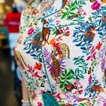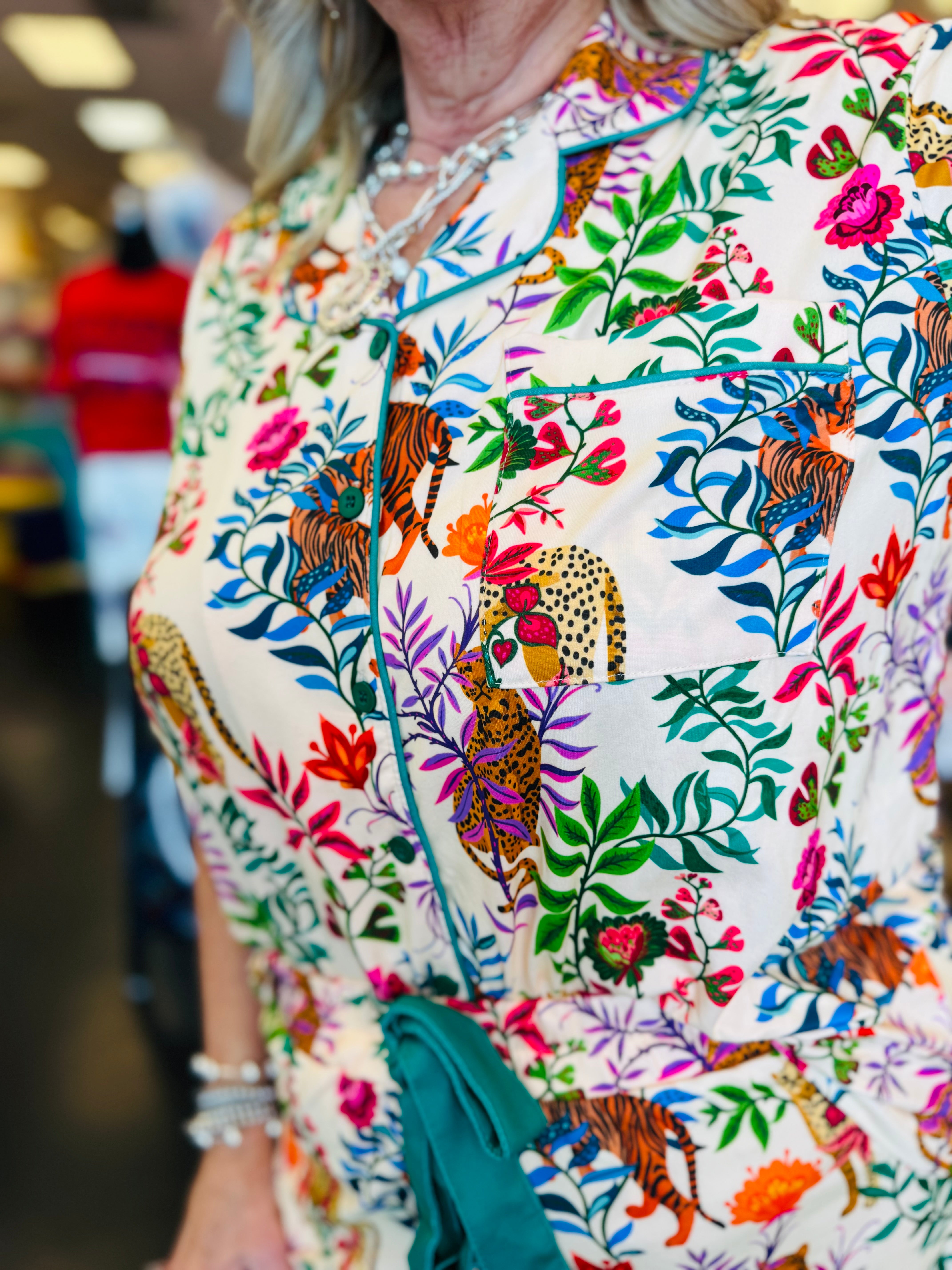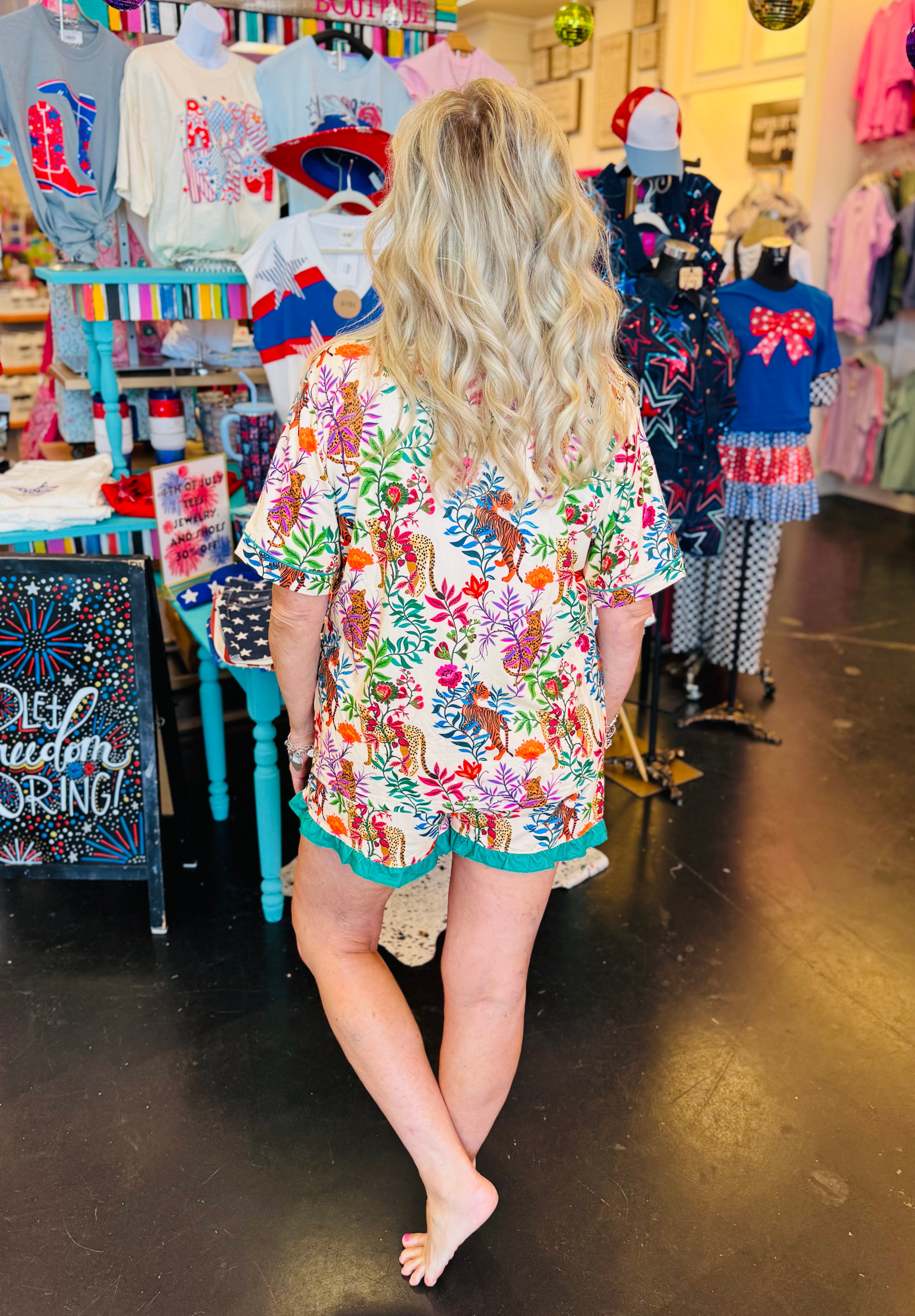 Lounge in style with our Jungle Oasis Ruffle Pajama Set. Featuring a bright and colorful print, button up top, and playful ruffle shorts with a decorative tie. Get ready for a comfortable and fun night's sleep!