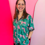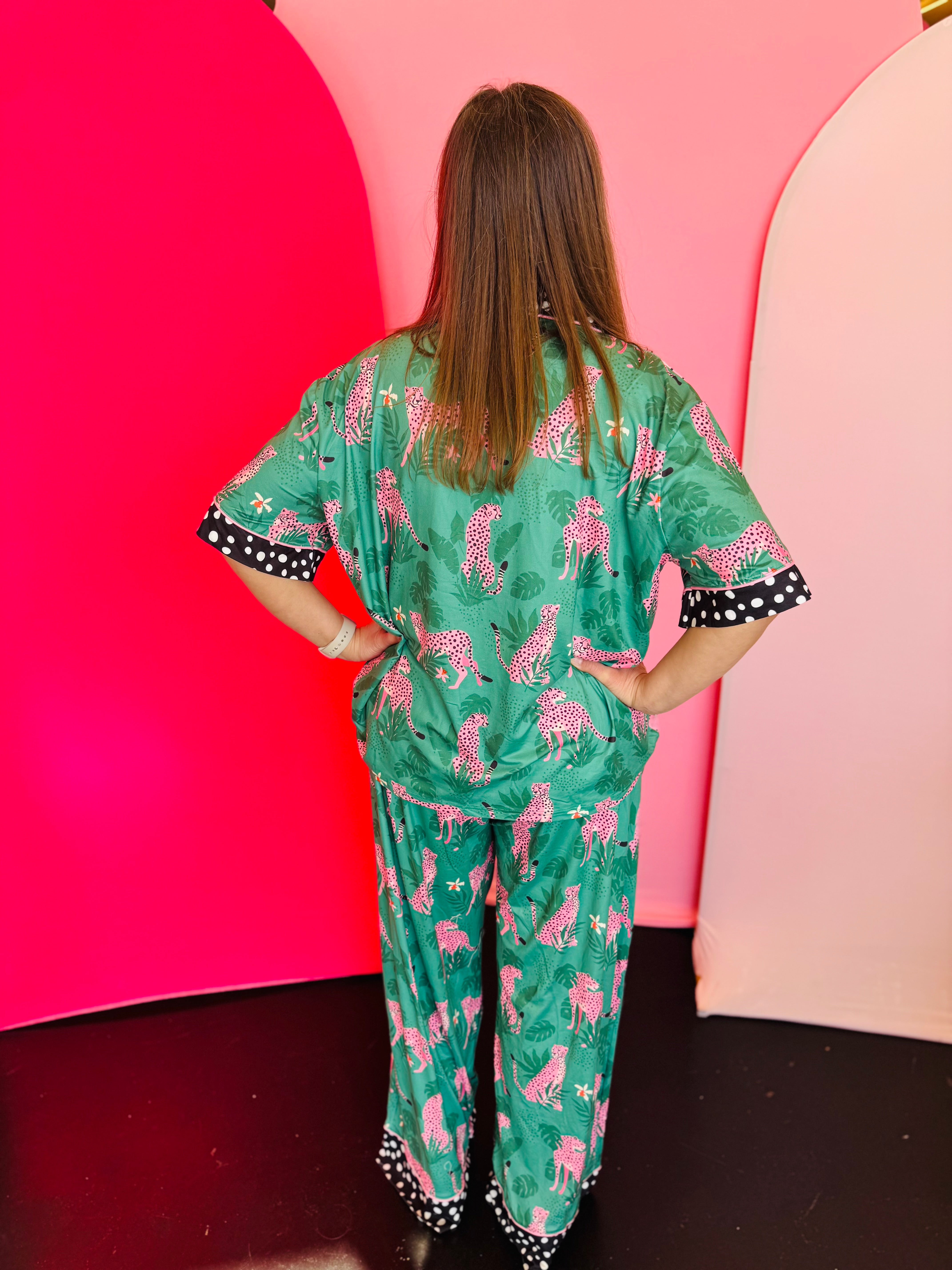 The bold green background is sprinkled with playful pink cheetahs, stars, and holiday details, while the contrasting black-and-white polka dot collar and cuffs add an elevated boutique touch. With pockets and an elastic waistband, these PJs deliver both style and function—your new favorite holiday lounge set has arrived.