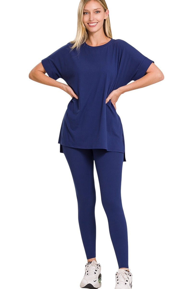 Stay comfy and chic with our Light Navy Loungewear Set. Made of buttery soft brushed dty microfiber, this set offers perfect stretch and recovery for an ultra-cozy fit. The round neck hi-low hem top adds a touch of style to your lounging look.