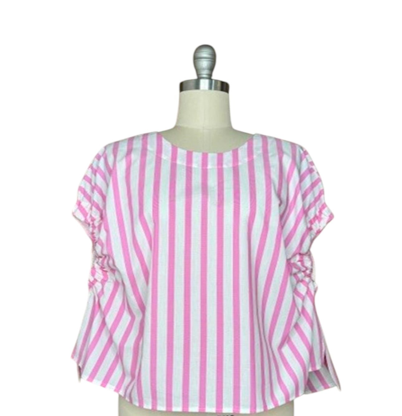 The Maeve Pink Ten Stripe Boxy Top exudes effortless chic with its ruched elastic sleeves and boxy silhouette. Made from luxurious fabric, it offers comfort and style in one. Elevate your wardrobe with this exclusive, artfully designed top.