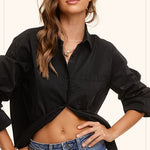 The Midnight Black Button Down Shirt is a versatile and classic top that exudes effortless elegance. The lightweight and breathable fabric features a smooth and lustrous finish, making it suitable for both formal occasions and daily wear. With its boxy and oversized silhouette, classic collar detail, and front pouch pocket, this shirt is the perfect choice for adding a touch of sophistication to any outfit.