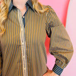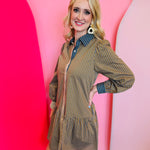 Brighten your wardrobe with the Olive & Navy Stripe Dress, a colorful statement piece that’s both chic and easy to wear. Designed with long sleeves and a button-down front, this dress offers a classic silhouette with a modern twist. The multi-color stripe fabric features bold olive and navy tones arranged in a striking color-block stripe pattern, making it perfect for everything from brunch to the office. Thoughtful details like side pockets add everyday convenience, while the relaxed fit ensures all-day comfort. Pair it with sneakers for a casual outing or dress it up with boots and a belt for a more polished look. Versatile and eye-catching, the Olive & Navy Stripe Dress is a must-have for effortless, colorful style.