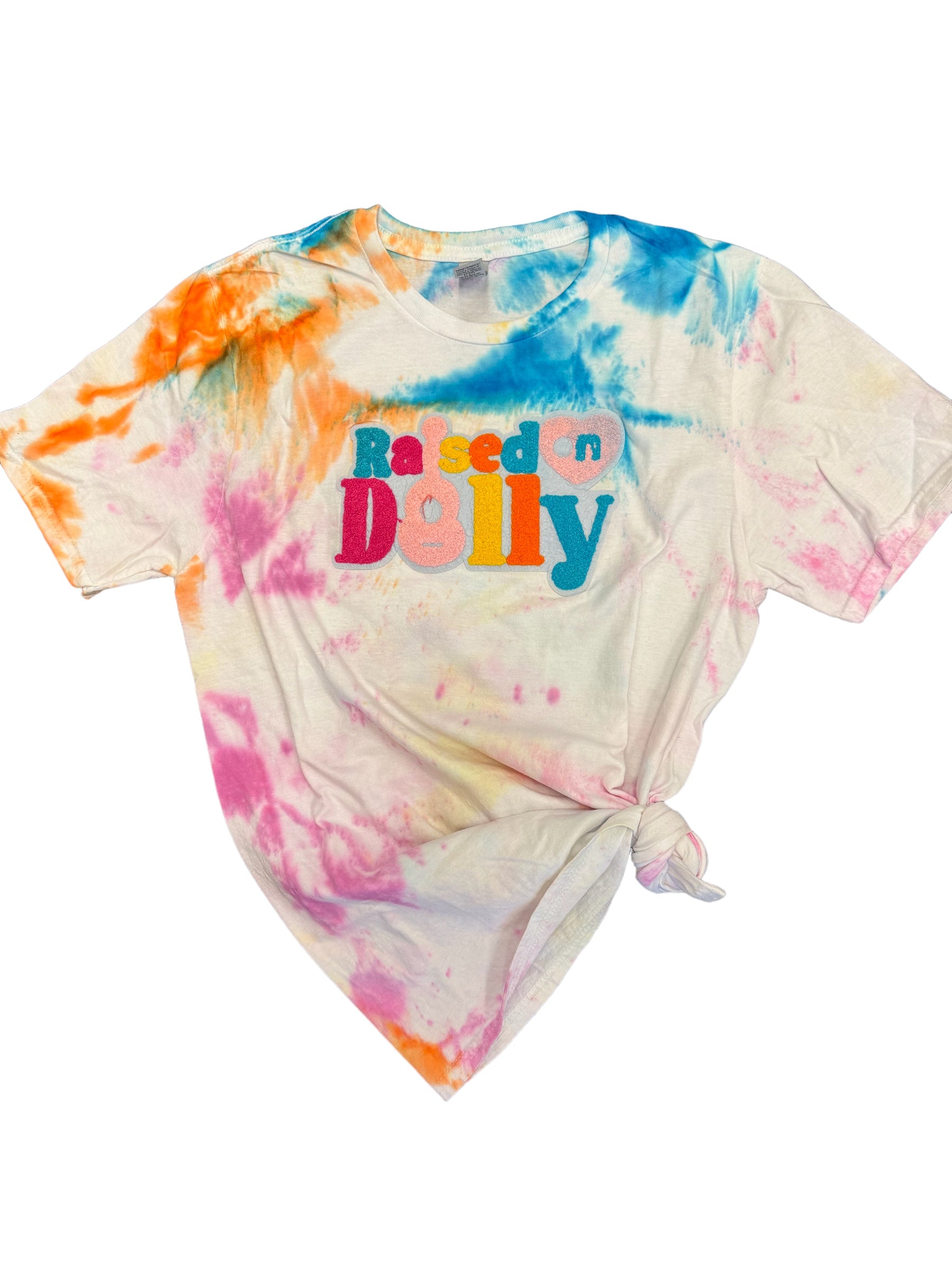Get ready to rock in this Raised On Dolly Tie Dye Tee! Featuring a colorful tie dye pattern in turquoise, orange, pink, and yellow, and a playful chenille patch, this tee is a must-have for any Dolly fan. With a design that everyone loves, you'll be the envy of the party.